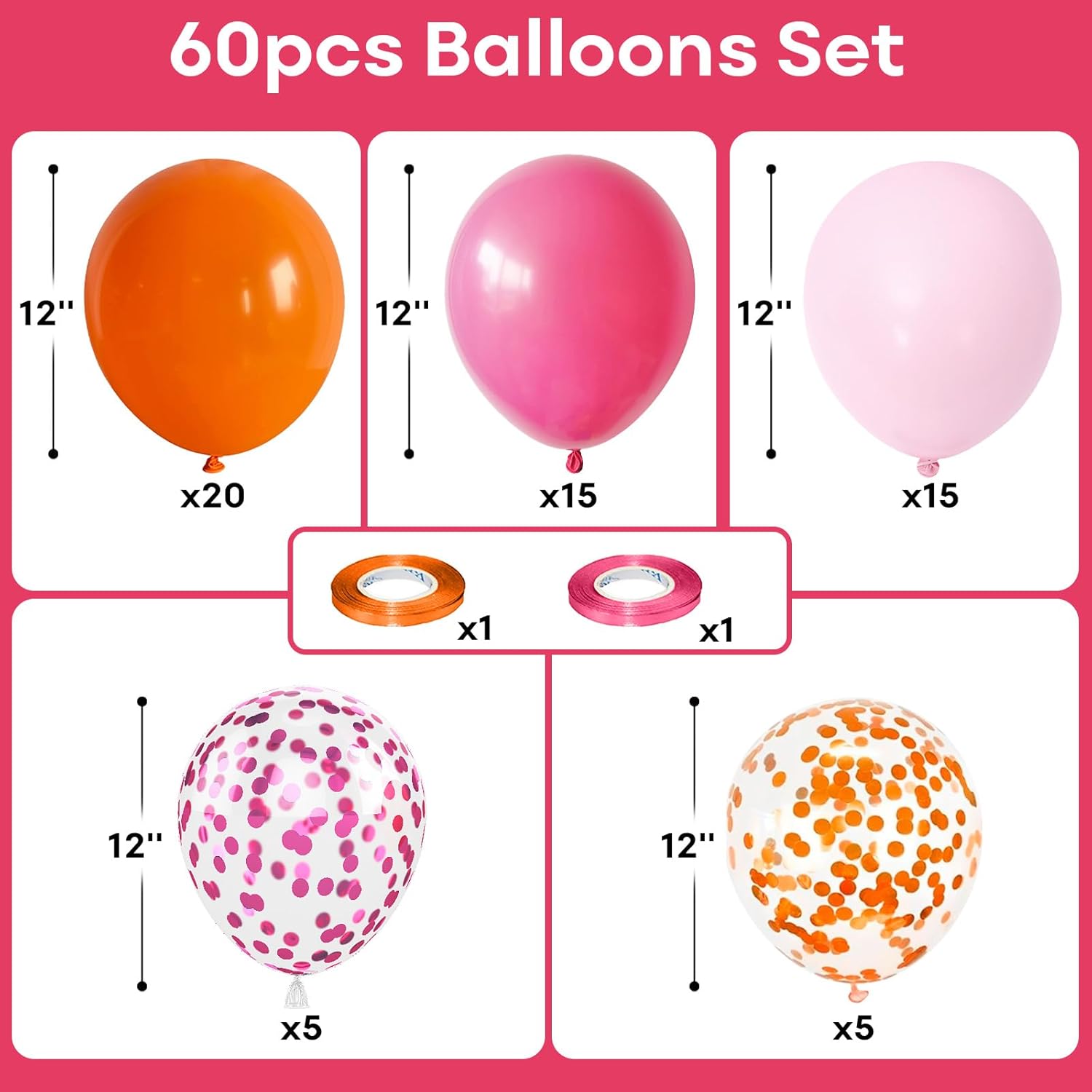 - ๐ Orange Hot Pink Balloon Includes: You will get 60 pack pink and orange latex balloons, all sized 12 inch, including matte orange balloon (20 pcs), fuschia pink balloons (15 pcs), pastel pink balloons ( 15 pcs), orange confetti balloons (5 pcs), hot pink confetti balloon (5 pcs) . Orange balloon ribbon * 1 pc, pink balloon curling ribbon * 1 pc. With perfect size and classical collocation, globos rosados will increase lots of fun to the pink and orange party decorations!