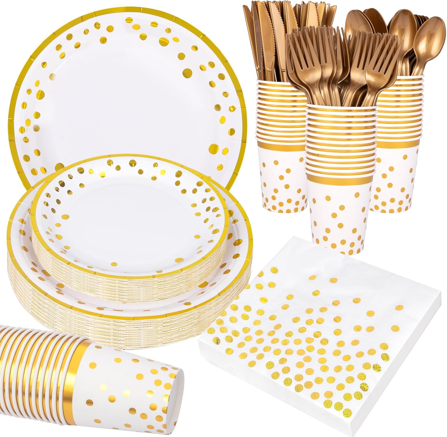 - 350pcs White and Gold Plates & Napkins Party Supplies -The white and gold party supplies include 50 birthday plates,50 white and gold paper plates,50 white napkins with gold polka dot,50 white paper cups,50 gold plastic forks,50 gold plastic knives and 50 gold plastic spoons,durable white and gold birthday decorations allow you to serves 50 guests at one time.