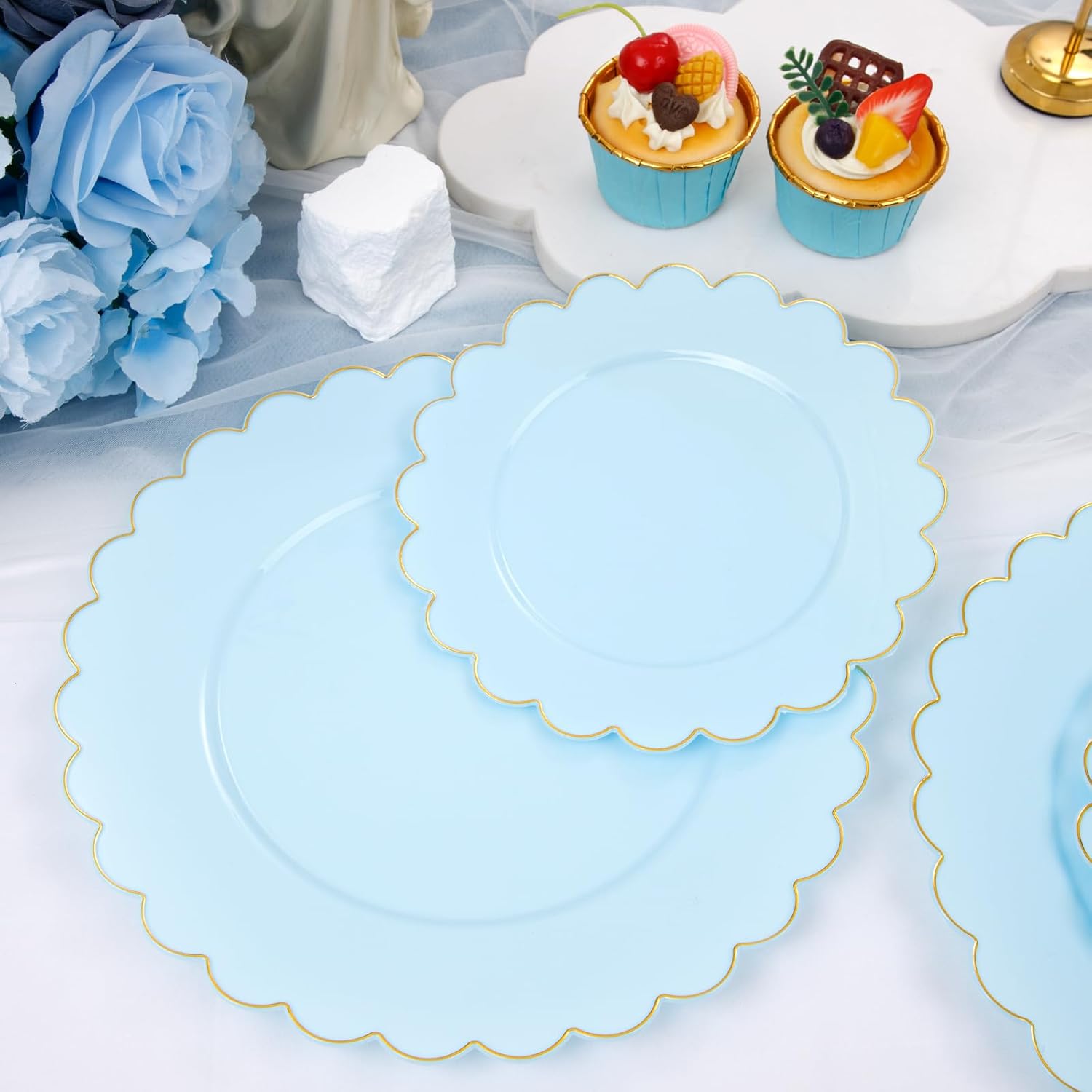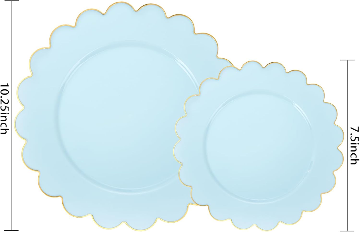 - PACKING: baby blue plastic plates with gold rim have includes 30pcs 10.25inch gold blue dinner plates,30pcs 7.5 inch dessert blue plates. No matter breakfast,lunch,or dinner these party plates will fit all your needs.