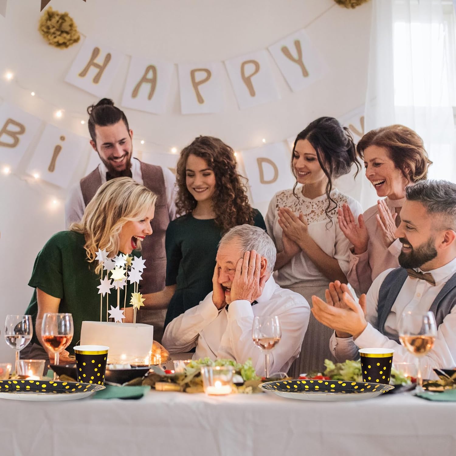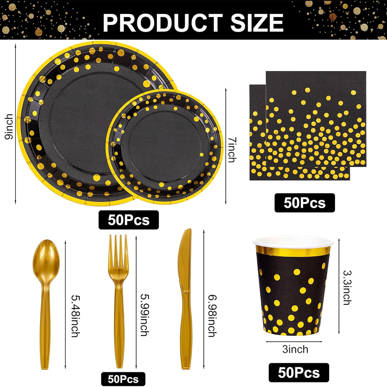 - 350pcs Black and Gold Party Decorations -The black and gold party supplies include 50 birthday plates,50 black and gold paper plates,50 black napkins with gold polka dot,50 black paper cups,50 gold plastic forks,50 gold plastic knives and 50 gold plastic spoons,durable black and gold birthday decorations allow you to serves 50 guests at one time.