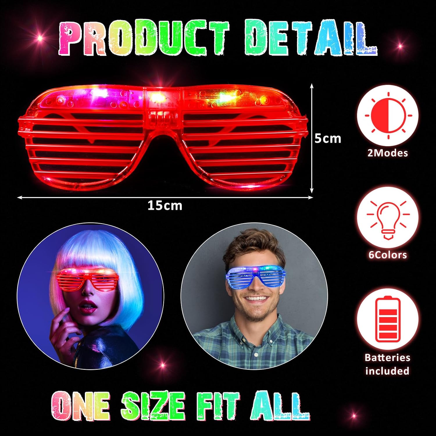 - Rave neon party favors: comes with 72 pieces led light up sunglasses in 2 different colors, namely red, blue; The quantity and colors are enough to meet the daily needs and suitable for rave parties;Warm tips:Only available to people aged 15 and above