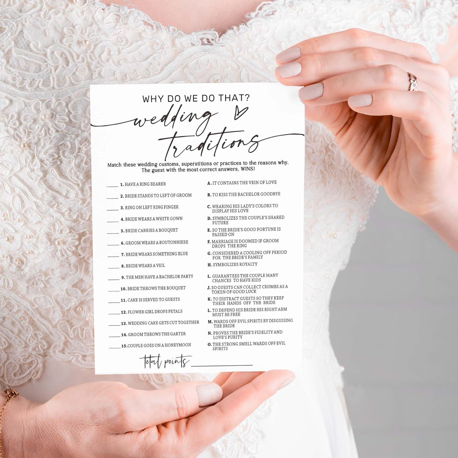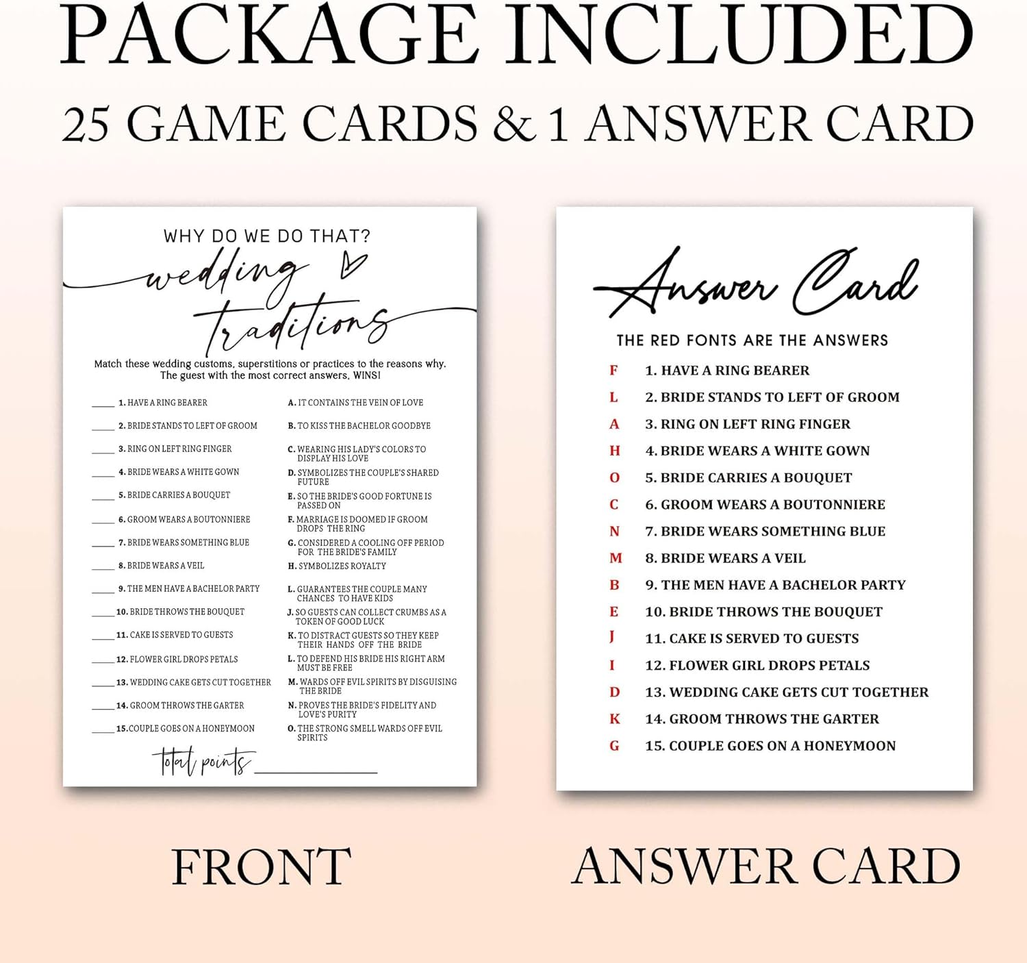 Wedding Shower Games Cards, Wedding Traditions Why Do We Do That, 25 Game Cards with 1 Answer Card, Engagement Party Wedding Games for Guests, Minimalist White Wedding Party Supplies - A08