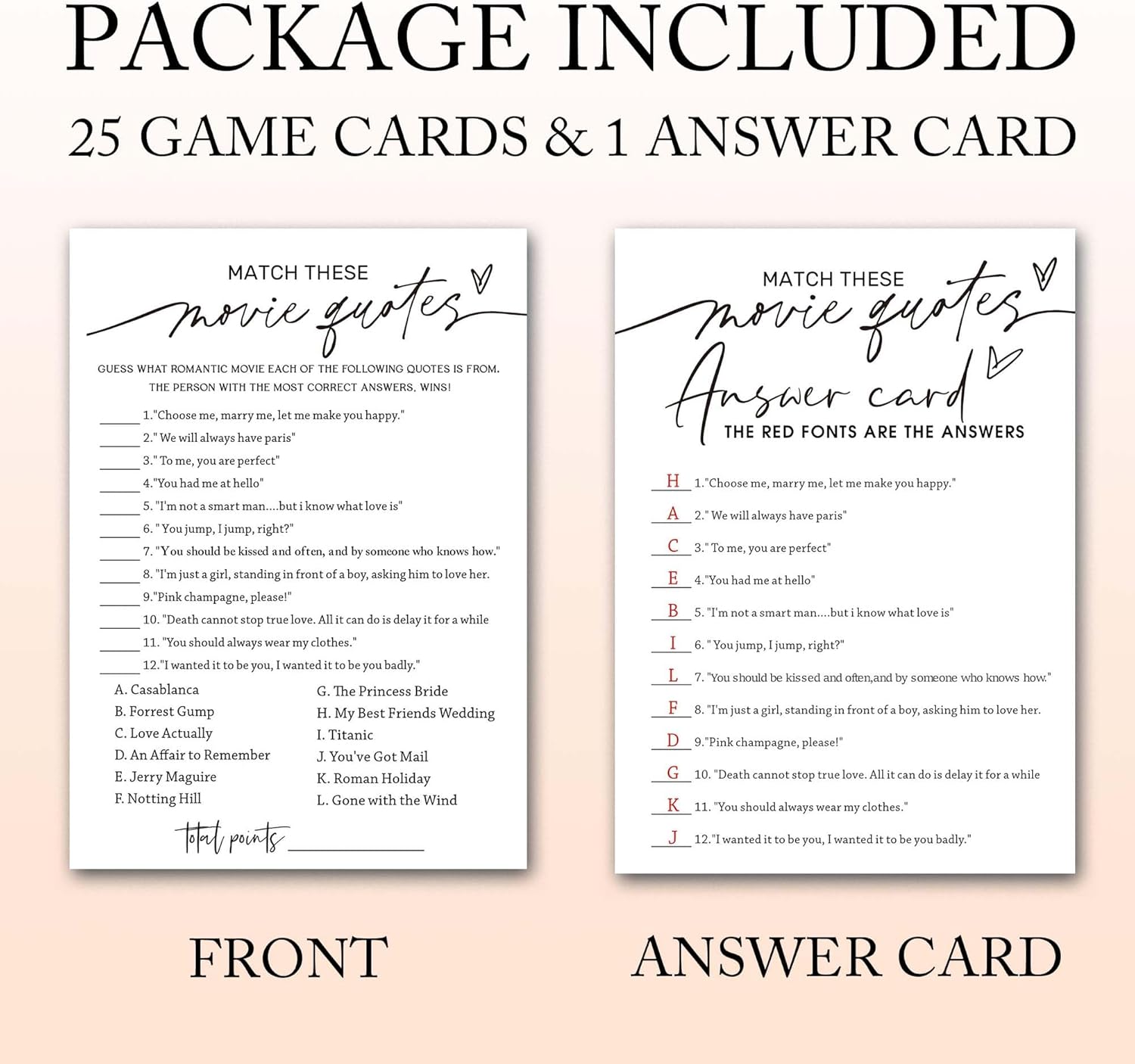 Wedding Shower Games Cards, Match These Movie Quotes, 25 Game Cards with 1 Answer Card, Engagement Party Wedding Games for Guests, Minimalist White Wedding Party Supplies - A09
