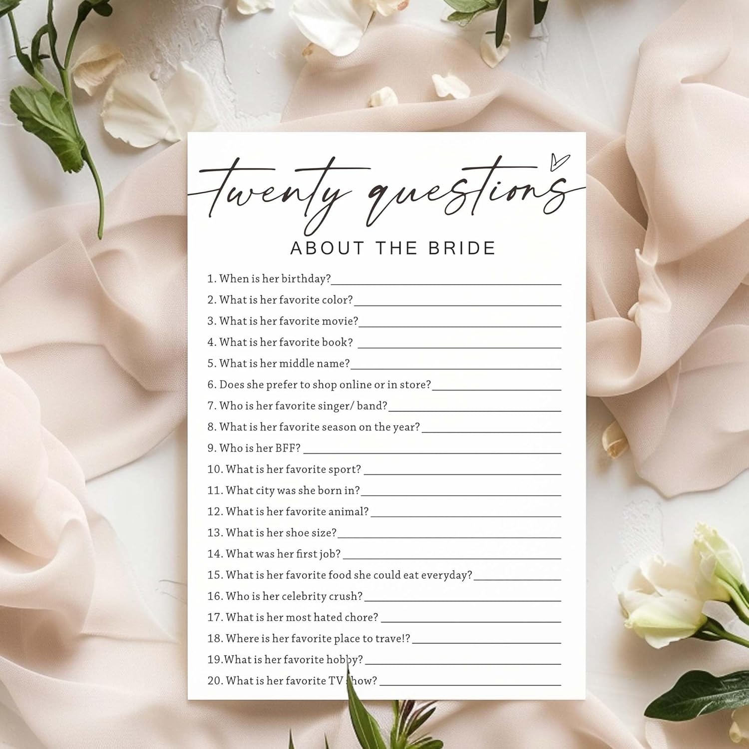 Bridal Shower Games Cards, Twenty Questions About The Bride, Bridal Shower Game 25 Guests, Engagement Party Wedding Games for Guests, Minimalist White Wedding Party Supplies - A05