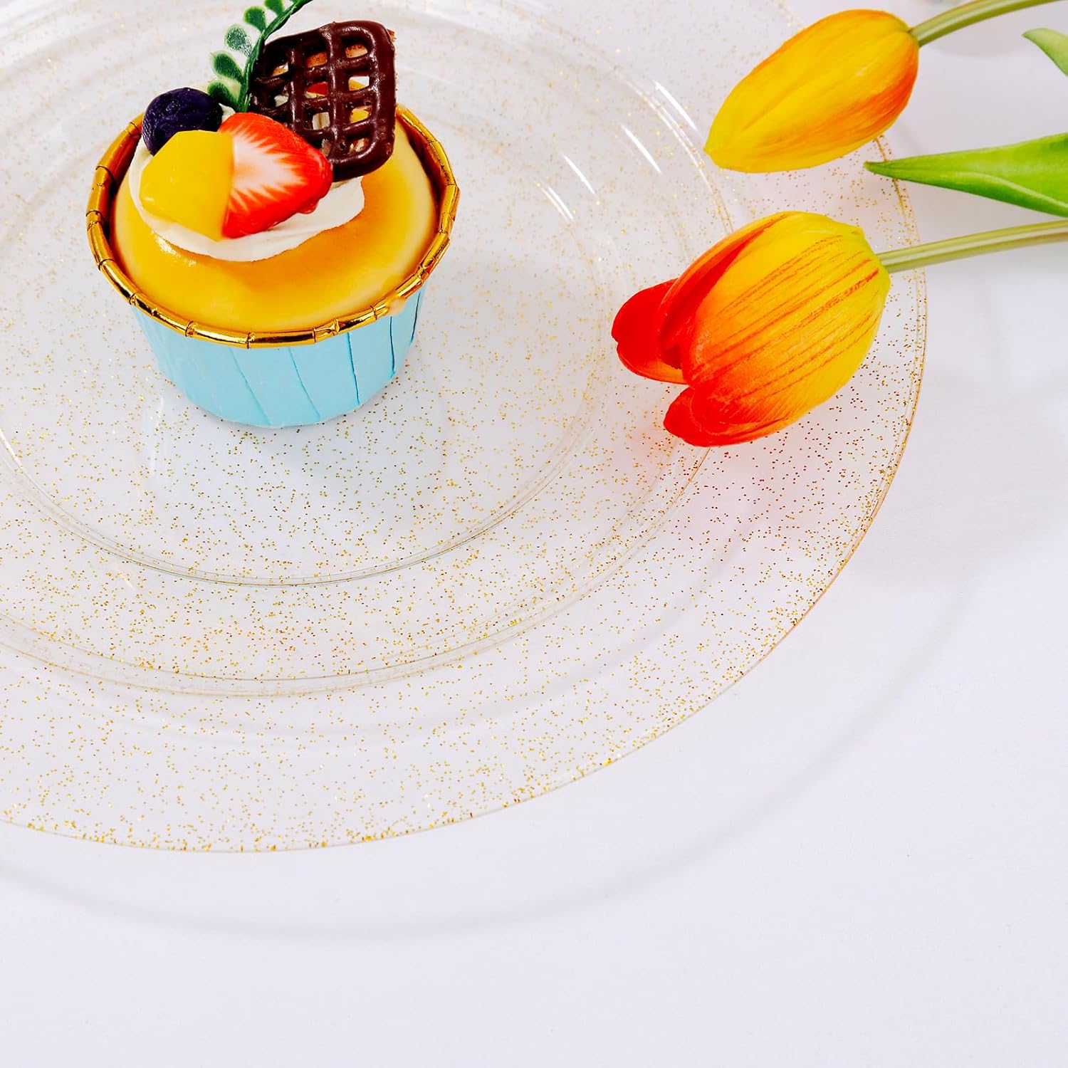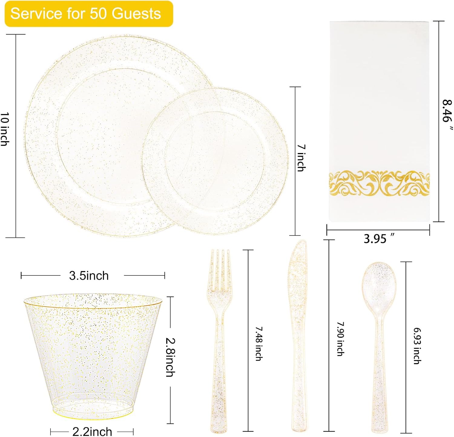- WHAT YOU GET: The disposable plastic plates set includes 50 dinner plates, 50 cake plates, 50 napkins, 50 cups and 50 gold glitter plastic silverware set, ensuring that each guest can enjoy a complete dining experience.