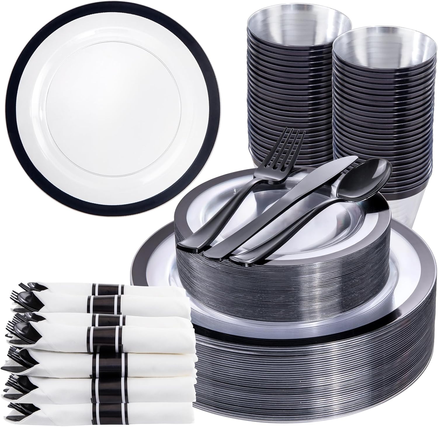 - 350PCS BLACK PLASTIC PLATES SET - Each set includes 100 black plates disposable, 150 black silverware, and 50 napkins, designed specifically for 50 guests and the black plastic plates ensuring that you have sufficient dining facilities at gatherings and can easily handle various occasions