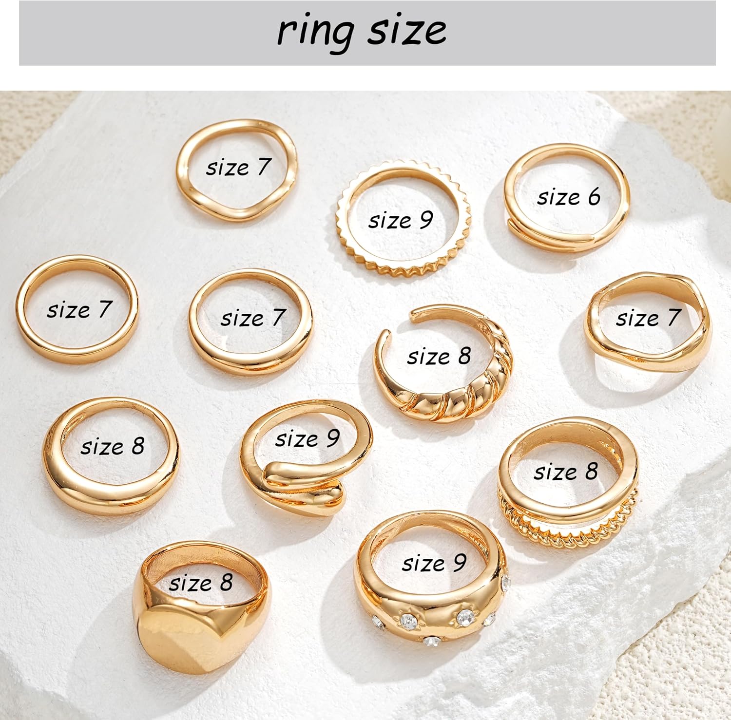 - Gold Band Rings : You will get a 12 pieces gold ring set. Those rings come in many different styles, include heart, signet, square, tubular,chunky and twist ring. There are enough quantity to meet your different outfits, match a best look for yourself!
