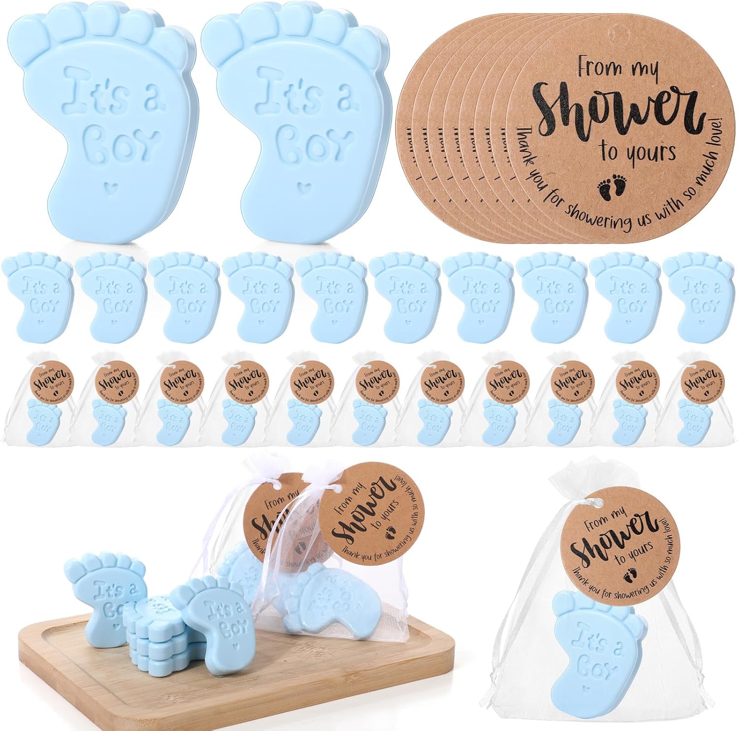 - Baby Shower Soap Favors Set: this package includes 50 scented footprint soaps, 50 thank you tags, and 50 white organza bags; Our beautiful combination of soap, tags, and organza bags will meet your daily use and gift needs for various occasions such as weddings, baby showers, bridal showers, and more