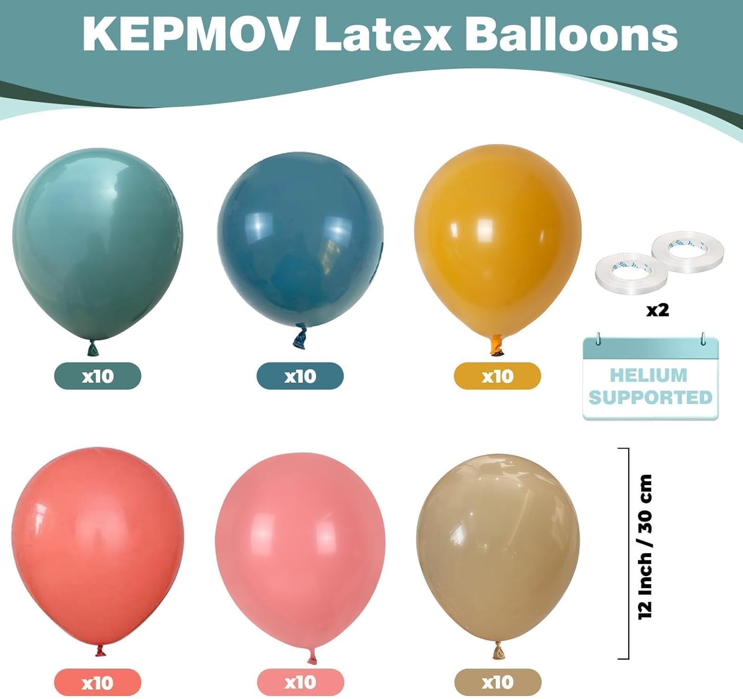 Boho Rainbow Balloons, 60Pcs Dusty Blue Blush Pink Balloons, 12 Inch Retro Mustard Yellow Slate Blue Balloon Assorted Colorful Balloon for Here Comes the Son Baby Shower Boho Safari Groovy Birthday
