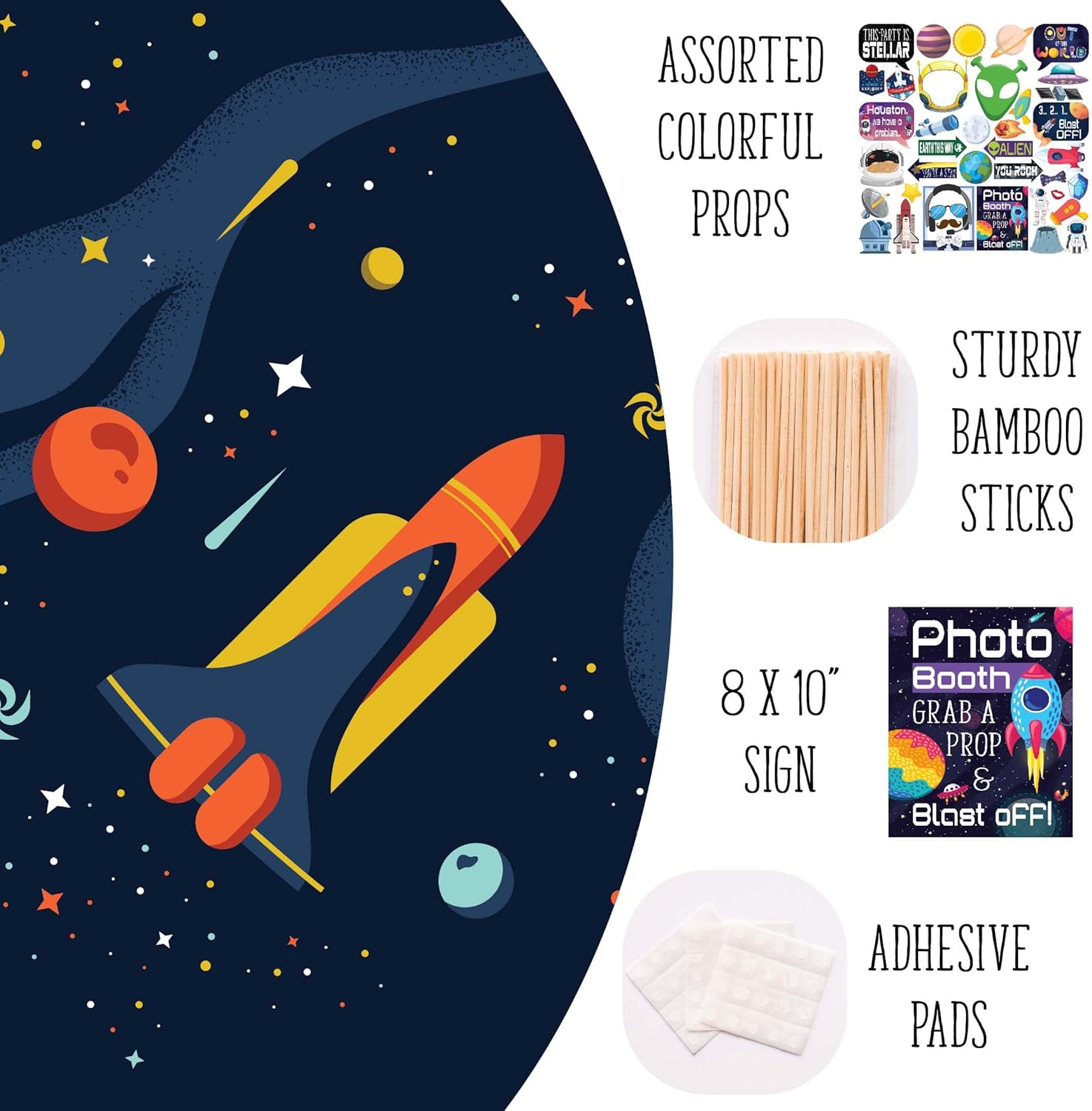 Space Photo Booth Props - 41-pc Photobooth Kit with 8 x 10-Inch Sign, 60 Adhesive Pads, 45 Sticks - Space Party Decor - Space Props - Out of This World Party Decorations