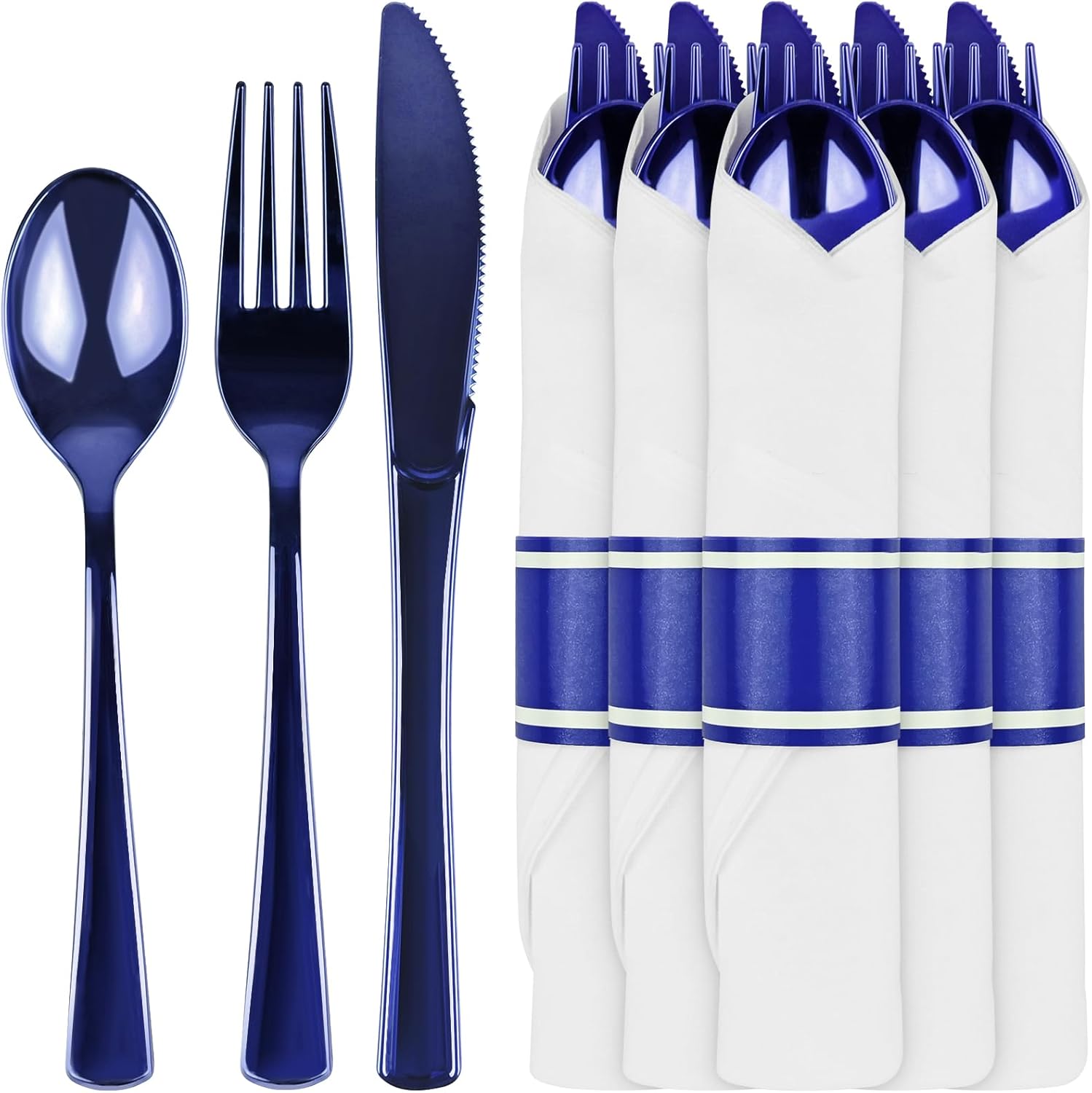 - Elegant & Luxurious - Impress your guests with an exquisite blue plastic silverware set wrapped in white dinner napkins. This luxurious color adds a touch of elegance and refinement to your next party or dinner function