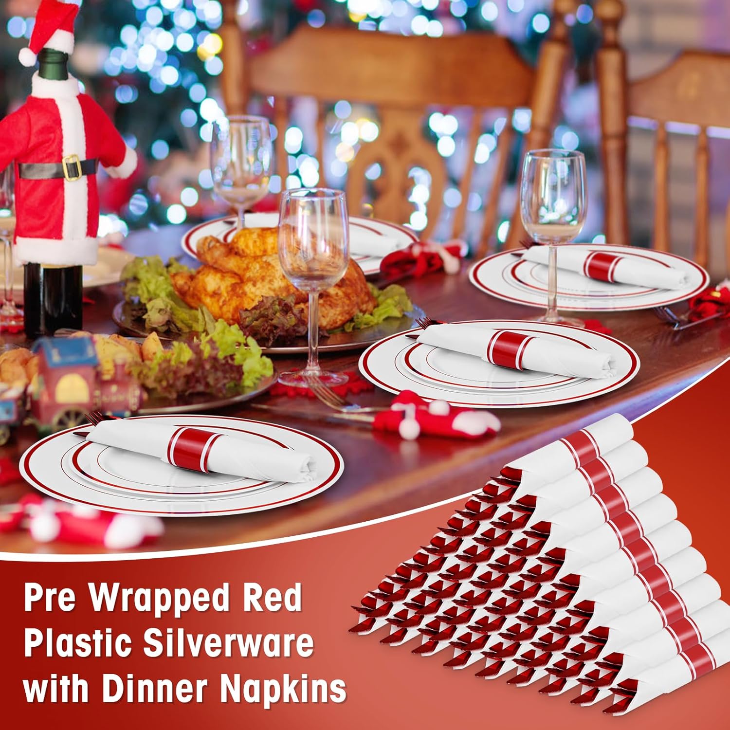 - Elegant & Luxurious - Impress your guests with an exquisite red plastic silverware wrapped in white dinner napkins. This luxurious color adds a touch of elegance and refinement to your next party or dinner function especially for Christmas