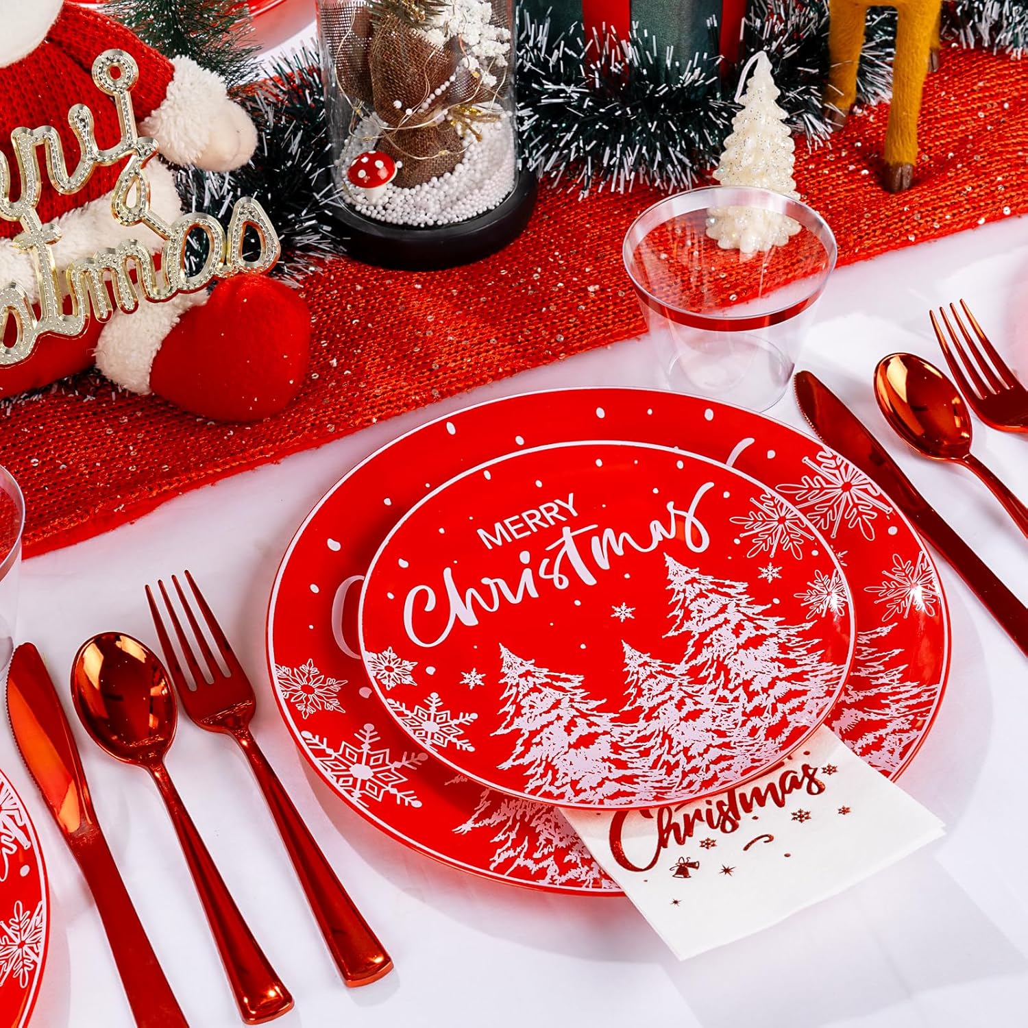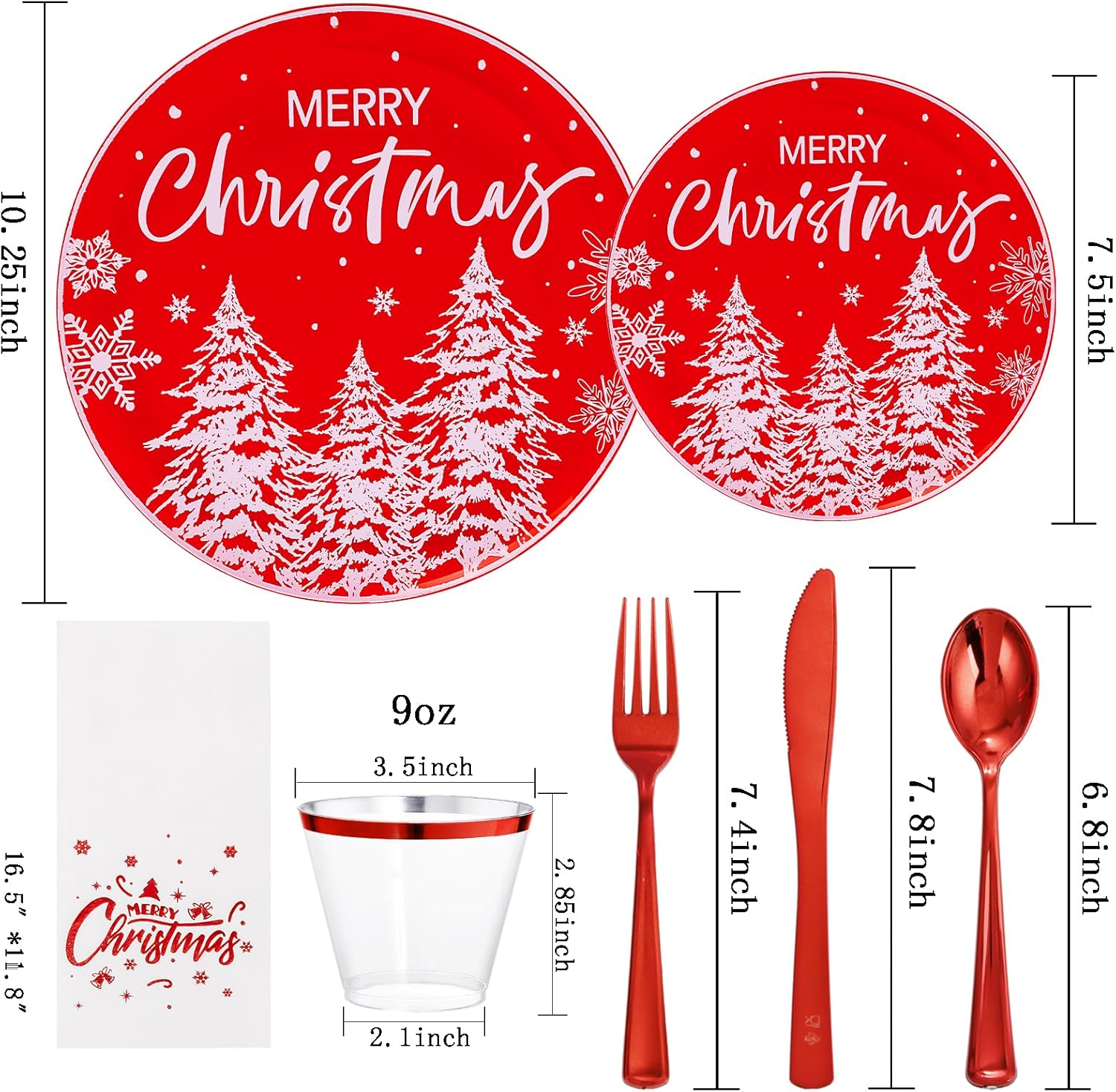 - Christmas Design: These red plastic plates feature classic Christmas tree and snowflake designs, combined with hot printed Merry Christmas. The party will be even more Christmas with these beautiful and lovely plastic Christmas plates decorated.
