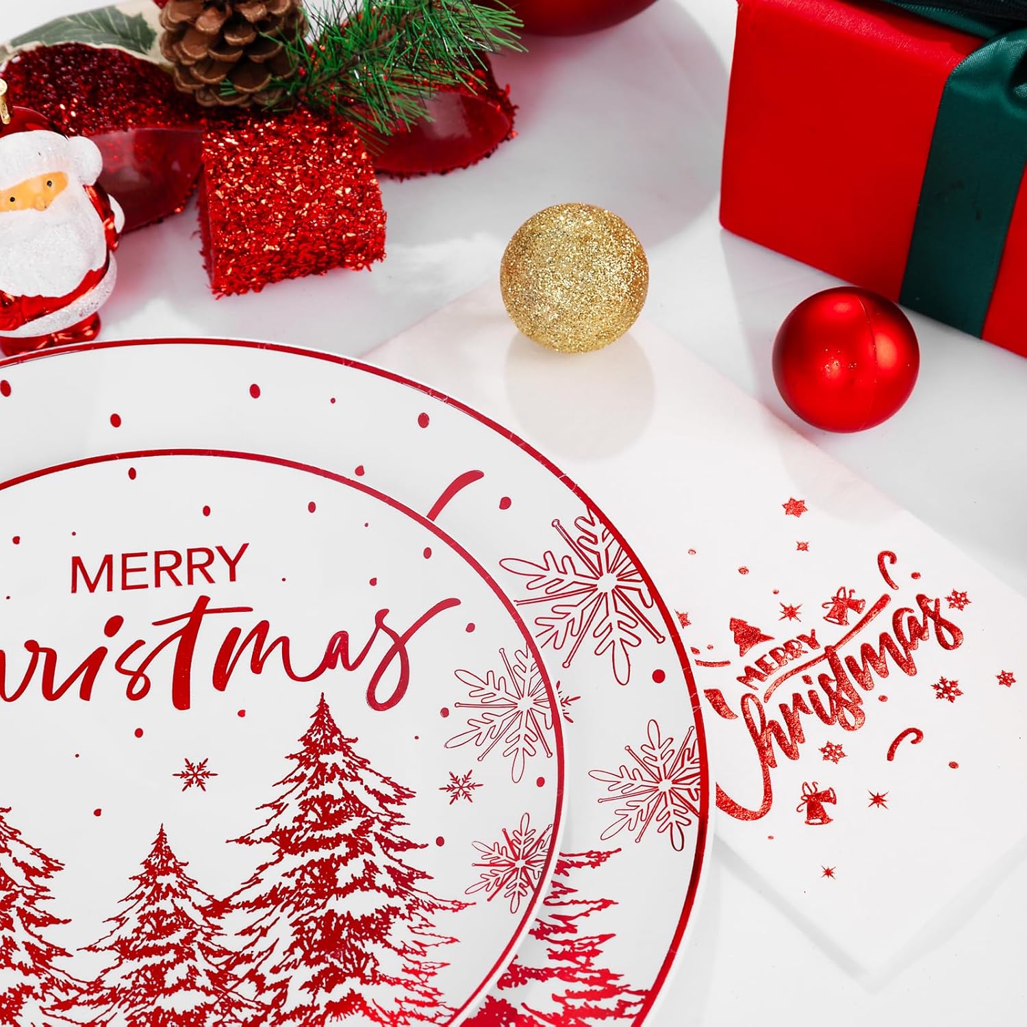 - Rich Stamping Pattern: christmas plastic plates disposable decorated with charming Christmas elements is painted with delicate festive motifs. Several majestic Christmas trees are decorated with dazzling snowflakes. Whether it's kids, loved ones, or friends alike, they'll love these red Christmas plastic plates and there's no doubt that they'll be the perfect choice for your party.
