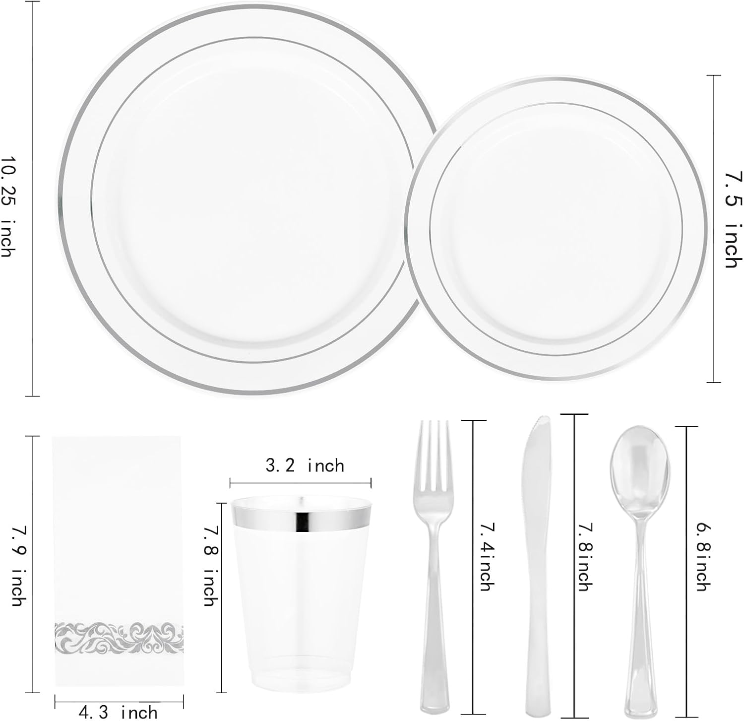 - Value Pack: This plastic dinnerware set includes 50 dinner plastic plates 10.25", 50 dessert plates 7.5", 50 silver plastic knives 7.8", 100 silver plastic forks 7.4",50 silver plastic spoons 6.8", 50 plastic cups with silver rim 10oz, 50 napkins with silver rim. Perfect for serving up to 50 guests a party, these silver plastic plates save time on separate purchases.