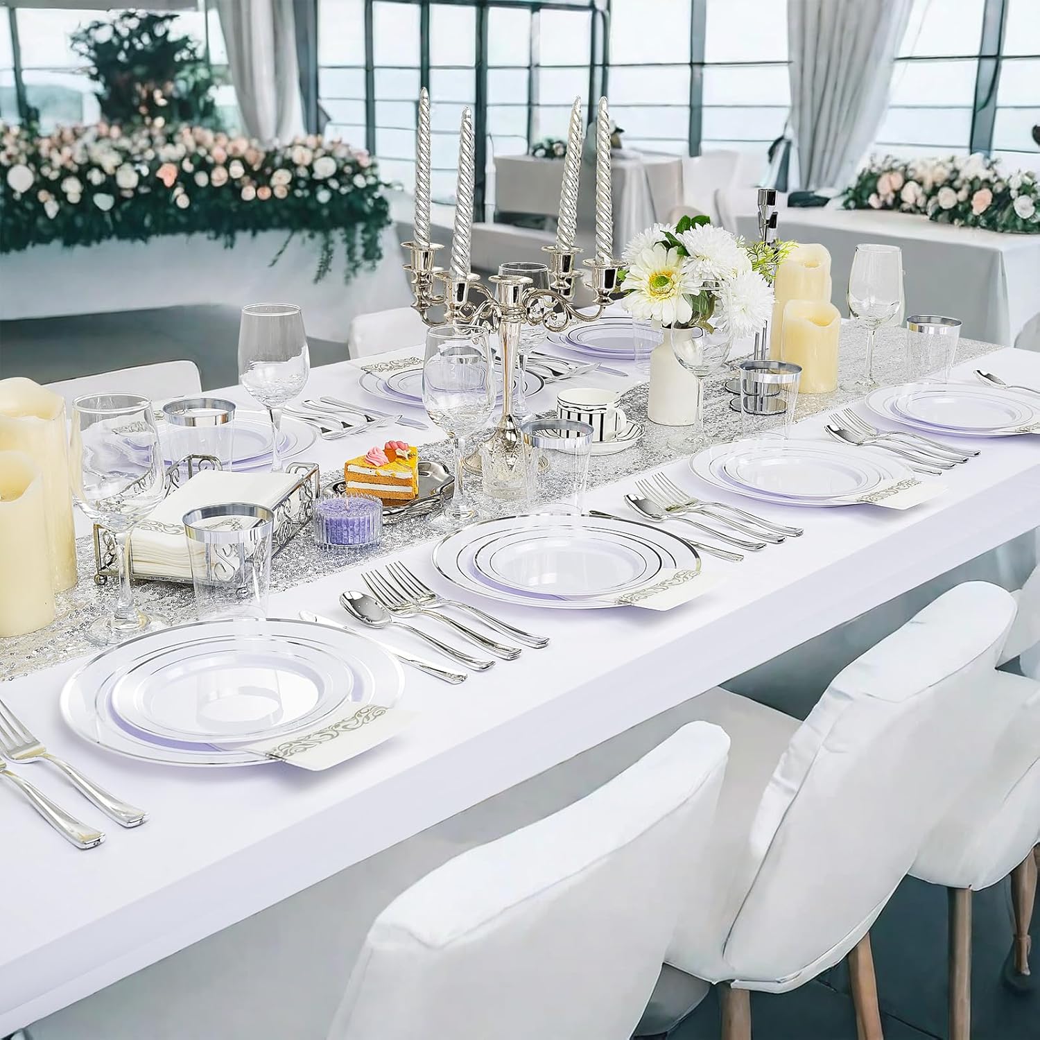 - Color : 400pcs White and Silver Plastic Dinnerware