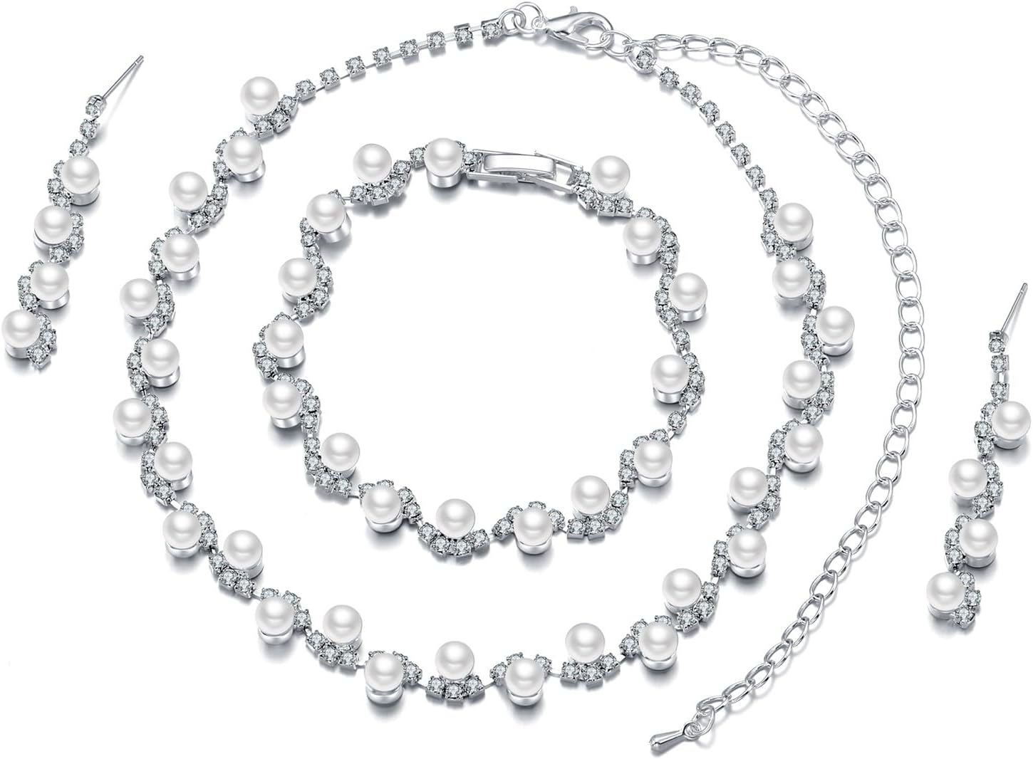 - Pearl Bridal Necklace Earring-- silver faux pearl jewelry set: Includes 1*pearl necklace, 1*pearl bracelet, 2*pearl earrings. Women's pearl necklace and earring sets can be worn alone or with other jewelry for different occasions