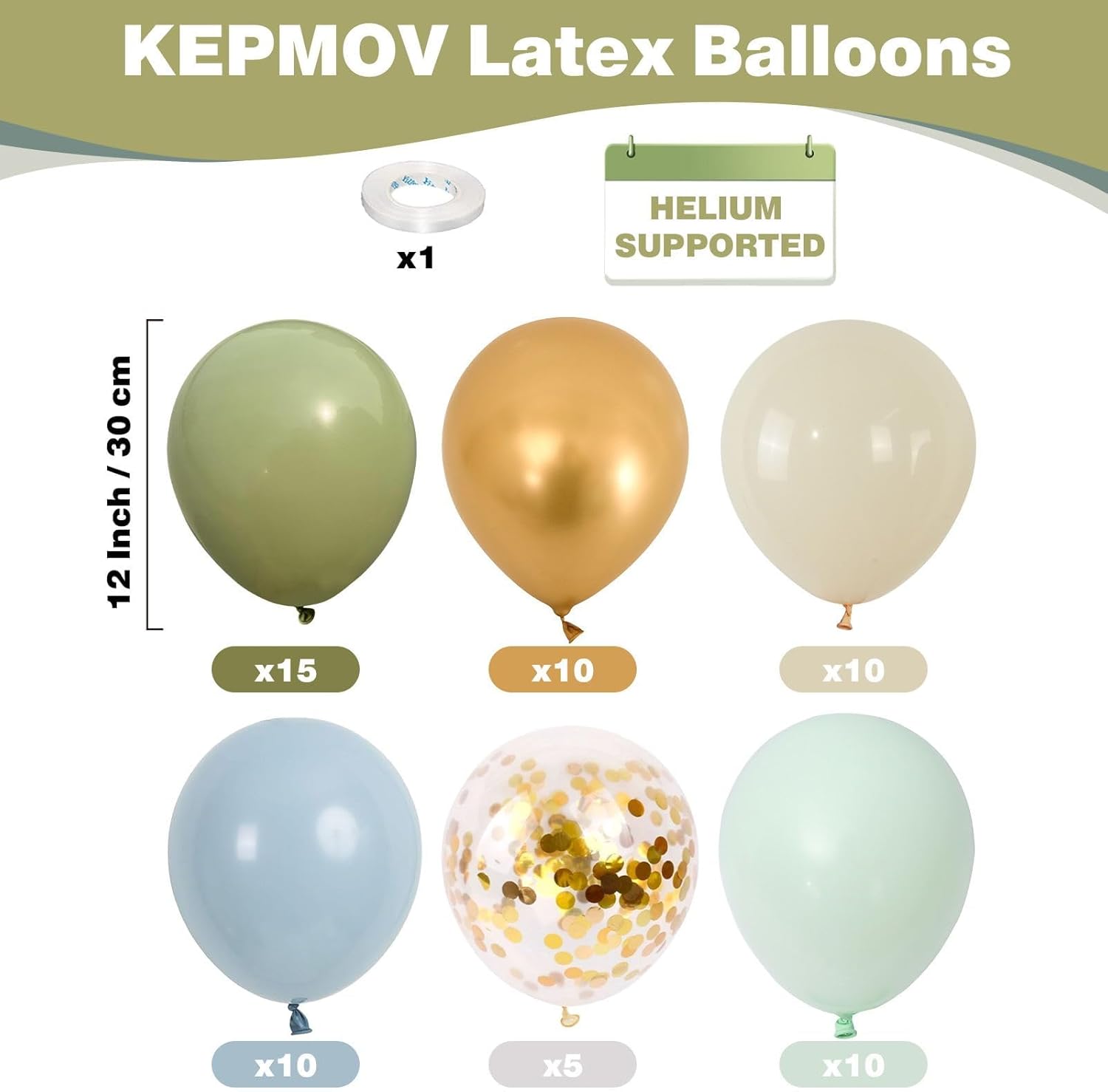 - What's Included: Enhance your party with our latex balloon Kit! This set features 15pcs sage green balloons, 10pcs sand white balloons, 10pcs dusty blue balloons, 10pcs pastel green balloons, 10pcs metallic gold balloons, 5pcs gold confetti balloons, all sized at 12 inches. Plus, we've included 1 balloon ribbon to perfect for your space theme decor.