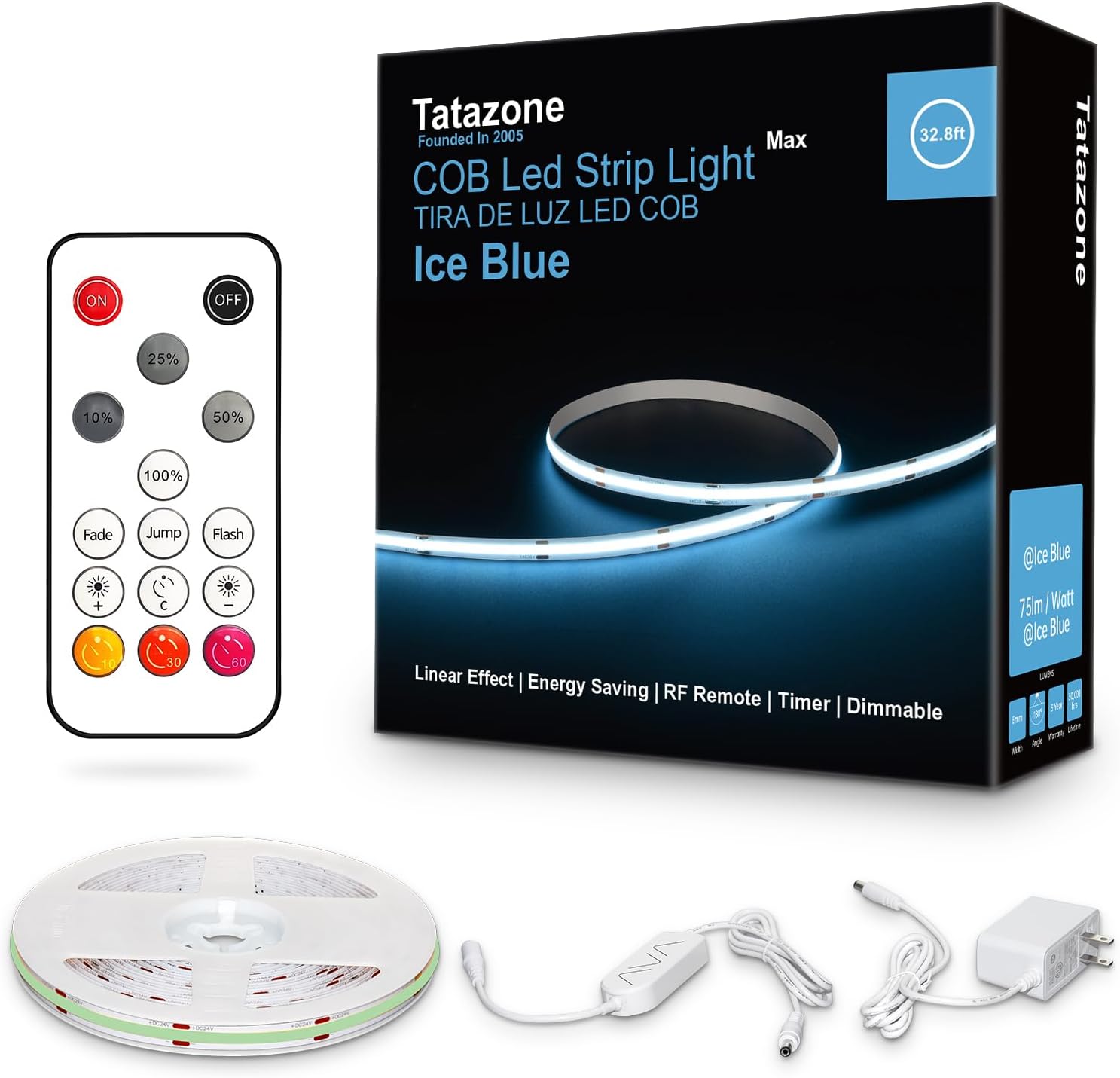 32.8ft Ice Blue COB Led Strip Lights with RF Remote, Dimmable Bright Adhesive Indoor Led COB Light Strip for Cabinet, Painting, Room, Bed