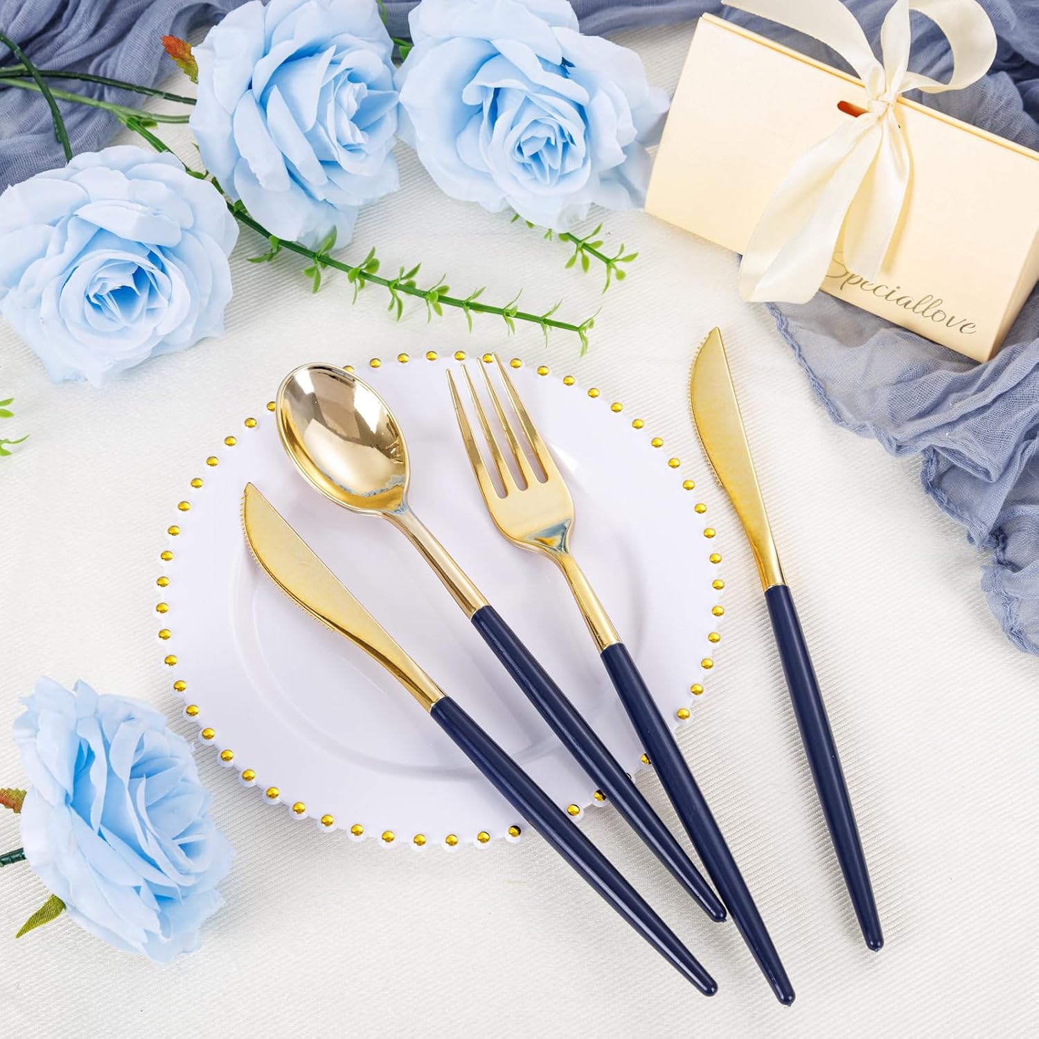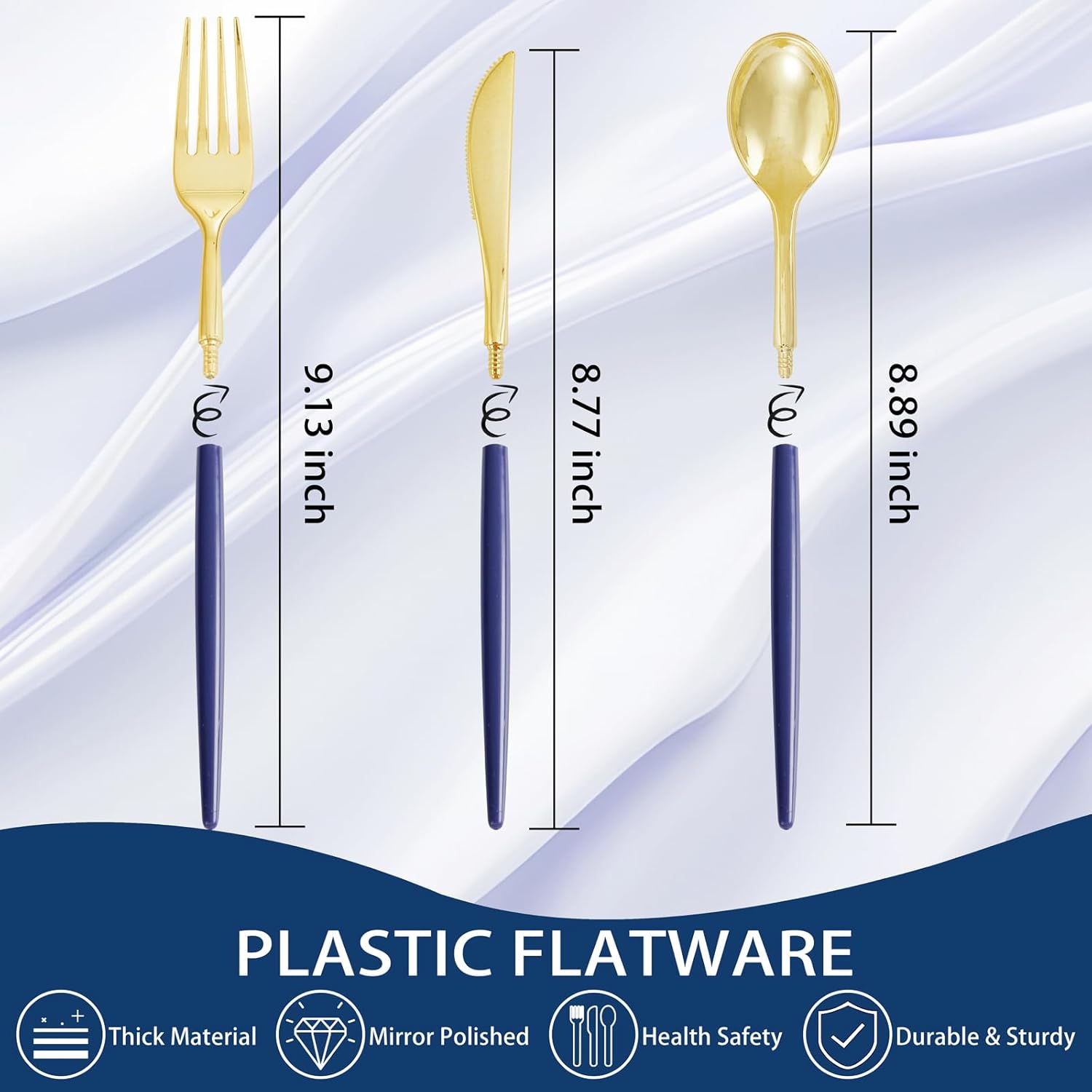 - Color : 102PCS Gold Plastic Cutlery with Dark Blue Handle