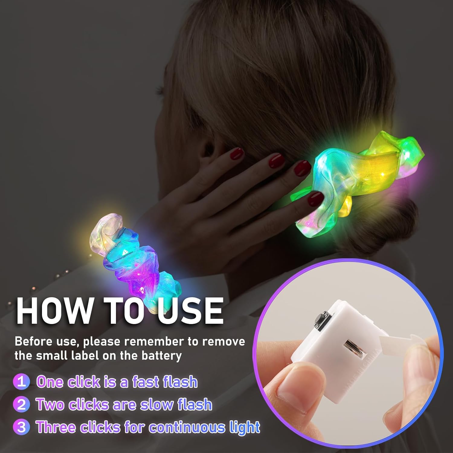 - Stand Out in the Crowd: Asawira light up hair scrunchies feature integrated LED lights that provide three dazzling light modes. Whether you’re at a glow party, sleepover, festival, or music event, you’ll shine bright and turn heads.