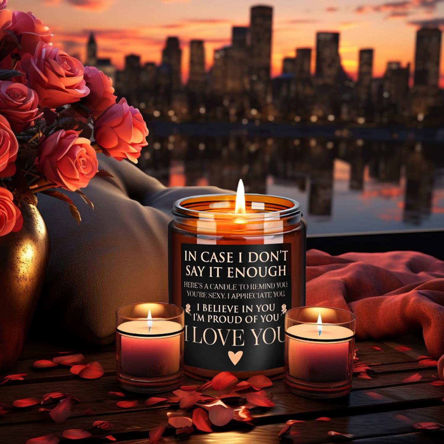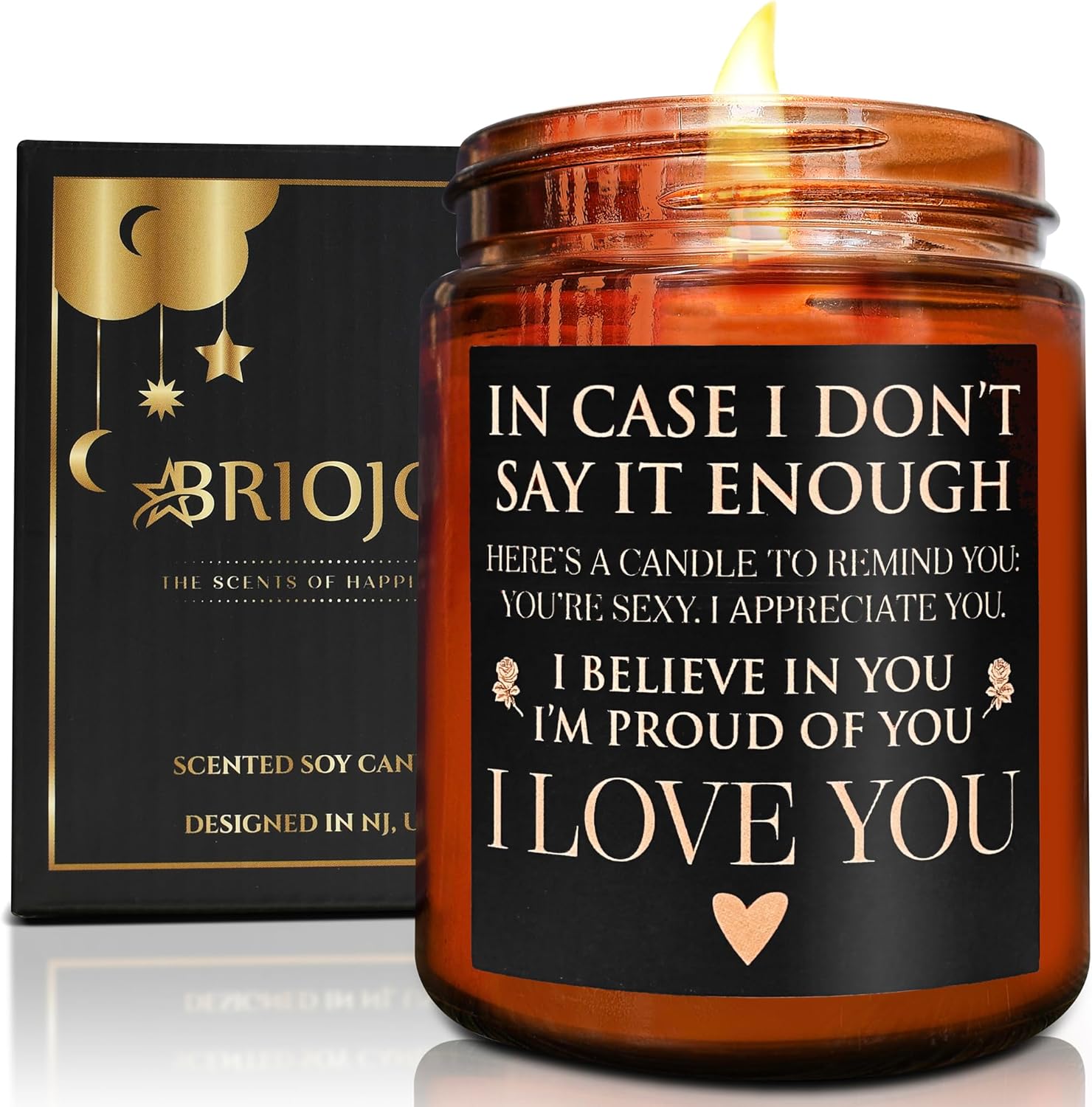 - ๐บUNIQUE COUPLE GIFTS FOR MEN & WOMEN: In the warm glow of our amber jar, this scented candle delivers more than just fragrance - itโs a daily dose of positivity. With a label that reads, โIN CASE I DONโT SAY IT ENOUGH,โ this candle whispers sweet affirmations to you: โYouโre sexy. I appreciate you. I believe in you. Iโm proud of you. I love you.โ Light it up, breathe in the soothing scent, and let these words wrap around you like a cozy embrace.