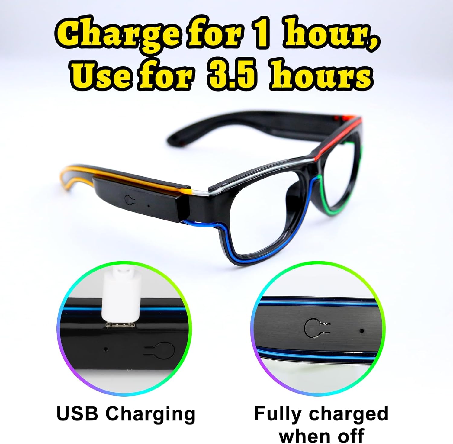 - Long-Lasting Rechargeable Power: Enjoy up to 3.5 hours of continuous glow with our rechargeable rave glasses, Never miss a beat at your next glow in the dark party with these long-lasting neon accessories. Easily recharge via USB and keep the party going all night long.