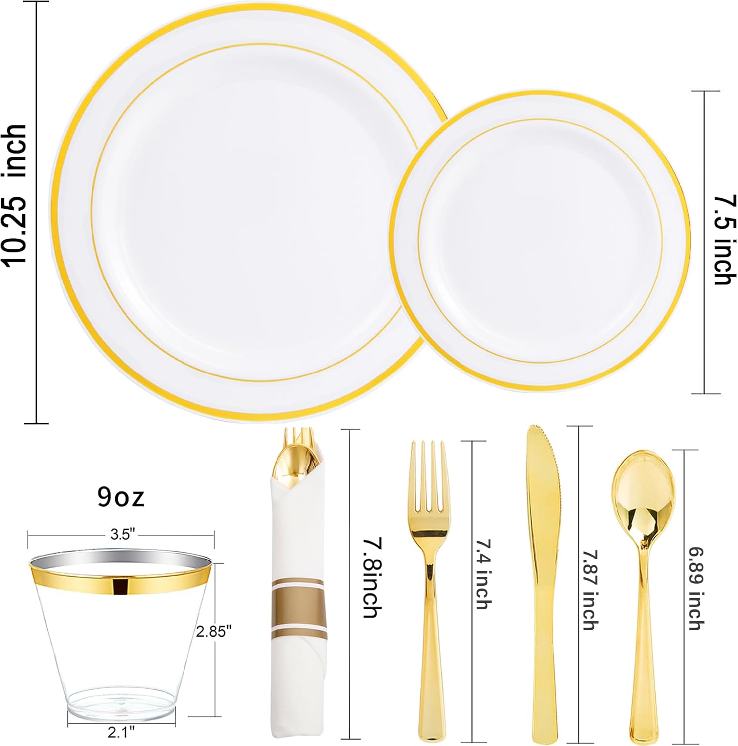 - WHAT YOU GET:700pcs gold plastic plates for 100 guests. Include: 100 Dinner Plates, 100 Dessert Plates, 100 Pre - Rolled Napkins with Silver Silverware, 100 Cups. It is great Plates and Napkins Party Supplies.
