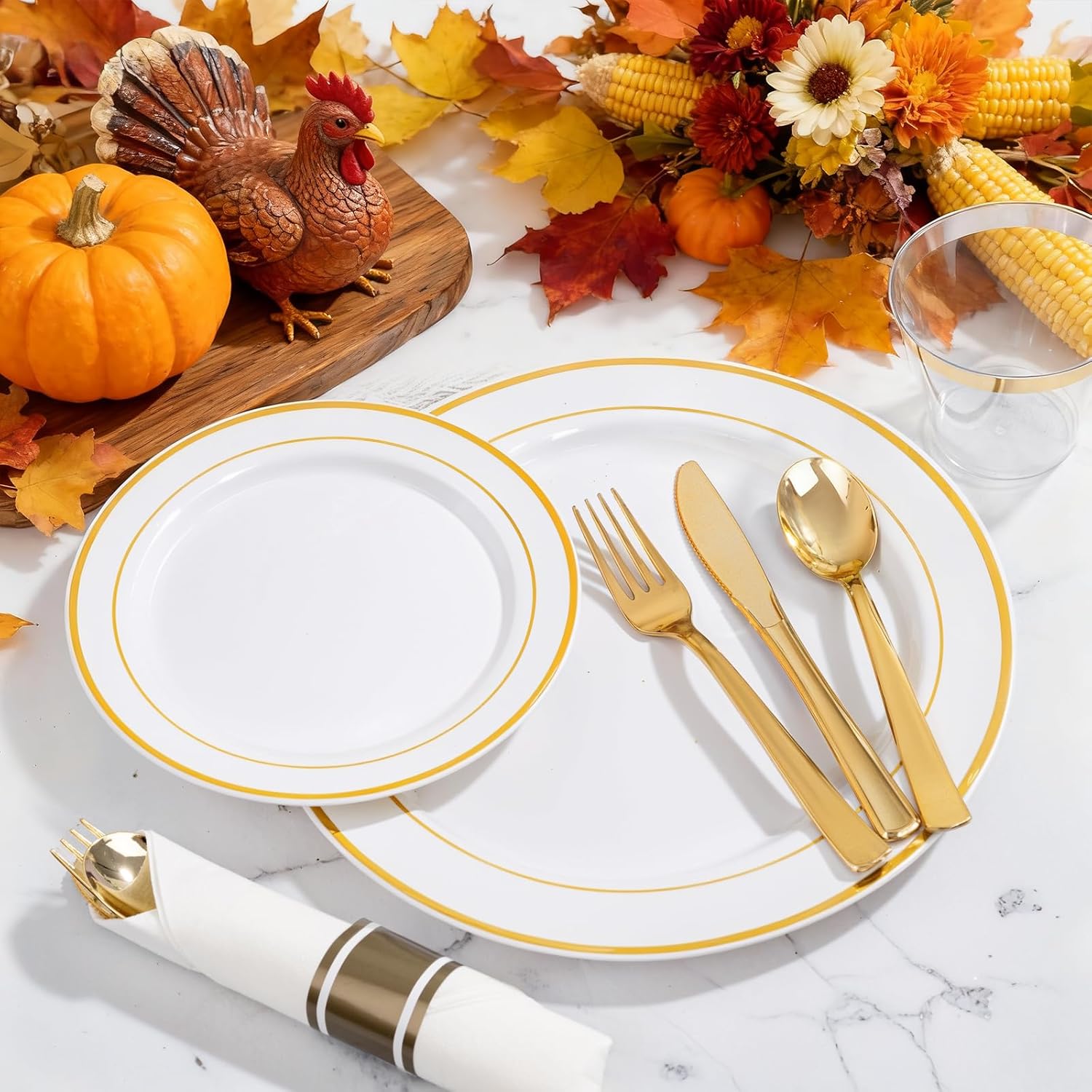 WELLIFE 700 Pcs Gold Plastic Plates for 100 Guests - Disposable Dinnerware Set,Party Supplies Includes 200 Gold Plates,300 Plastic Silverware,100 Napkins,100 Cups for Party and Thanksgiving
