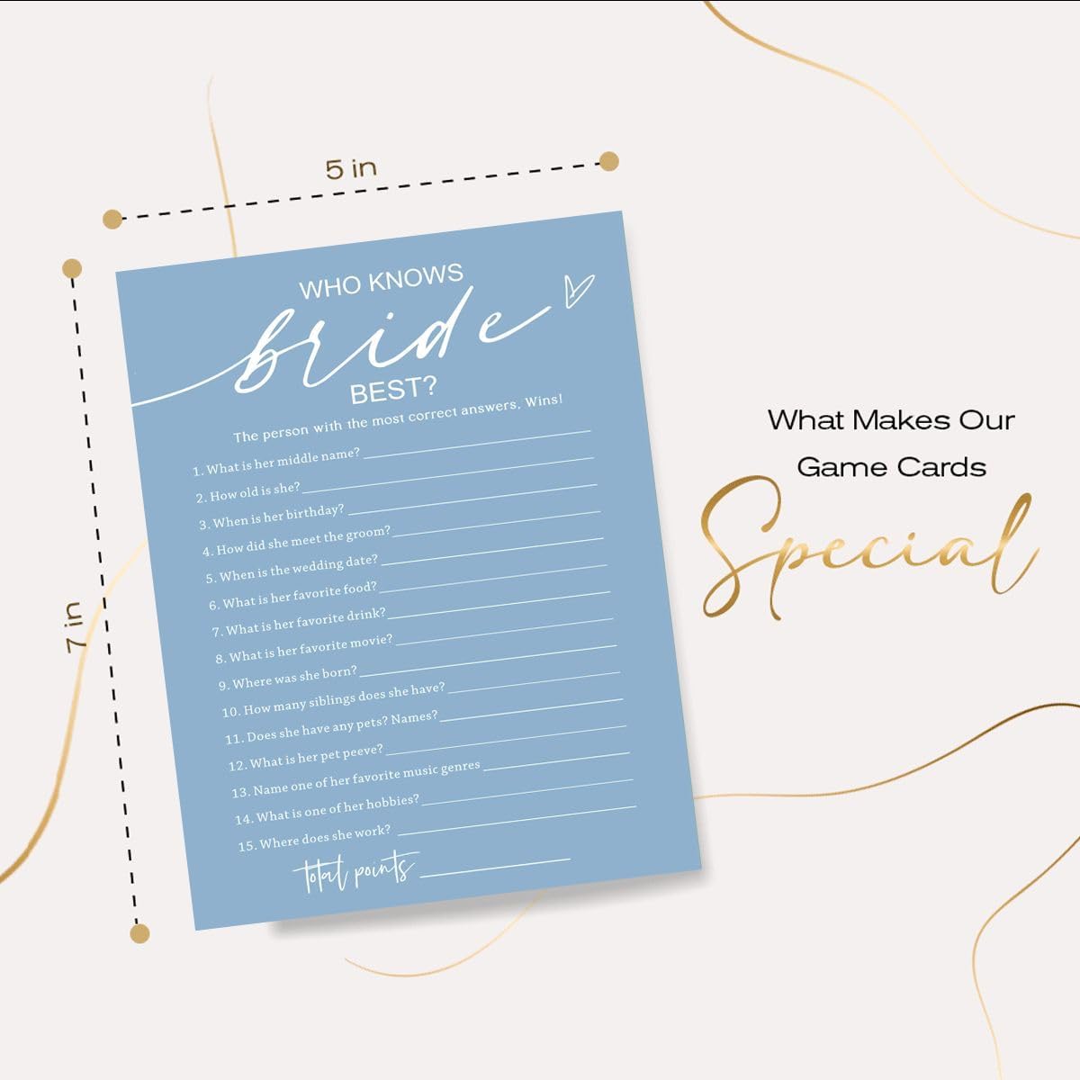 Bridal Shower Games Cards, Who Knows The Bride Best, 25 Guest Wedding Games, Minimalist Blue Wedding Party Supplies - B03