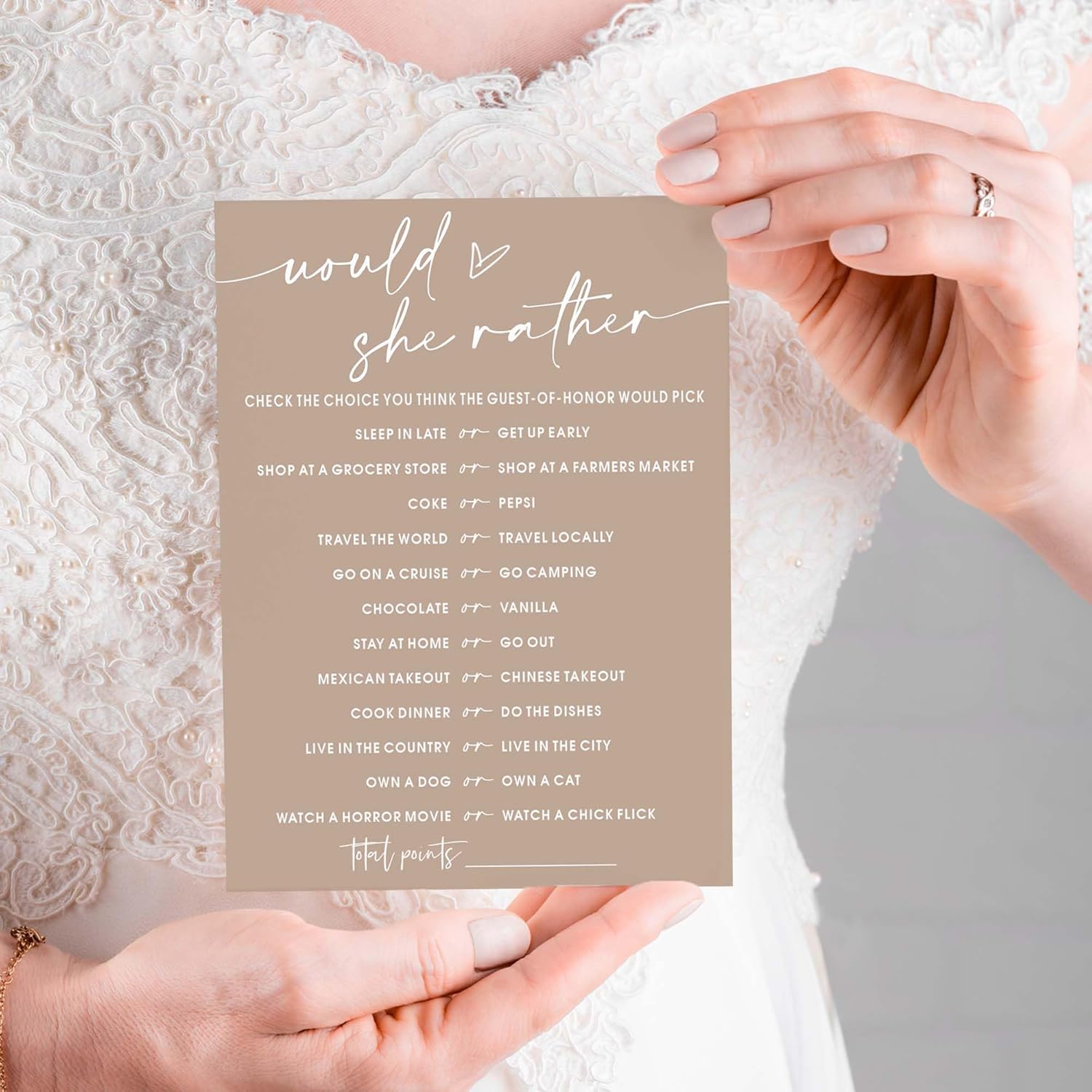 Bridal Shower Games Cards, Would She Rather Bridal Shower Game for 25 Guests, Engagement Party Wedding Games for Guests, Minimalist Brown Wedding Party Supplies - D11