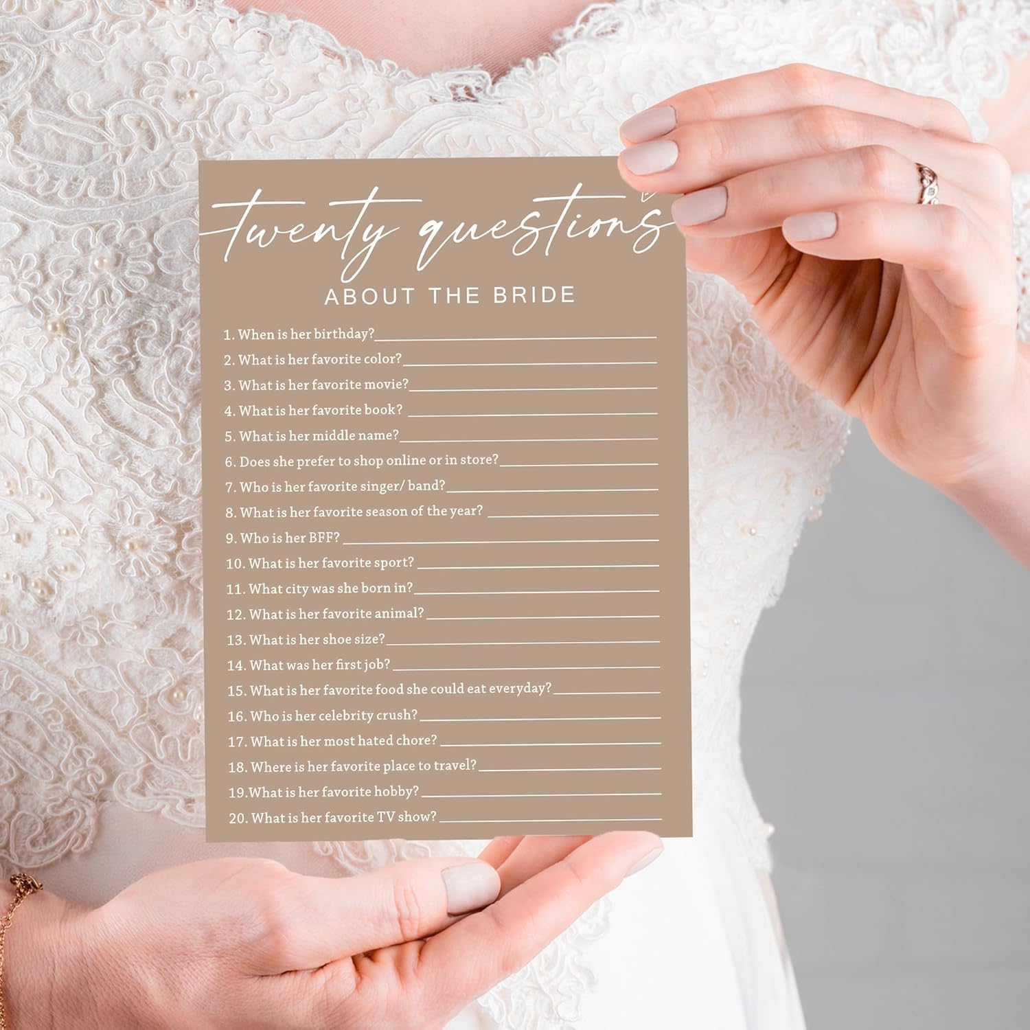 Bridal Shower Games Cards, Twenty Questions about The Bride, Engagement Party Wedding Games for 25 Guests, Minimalist Brown Wedding Party Supplies