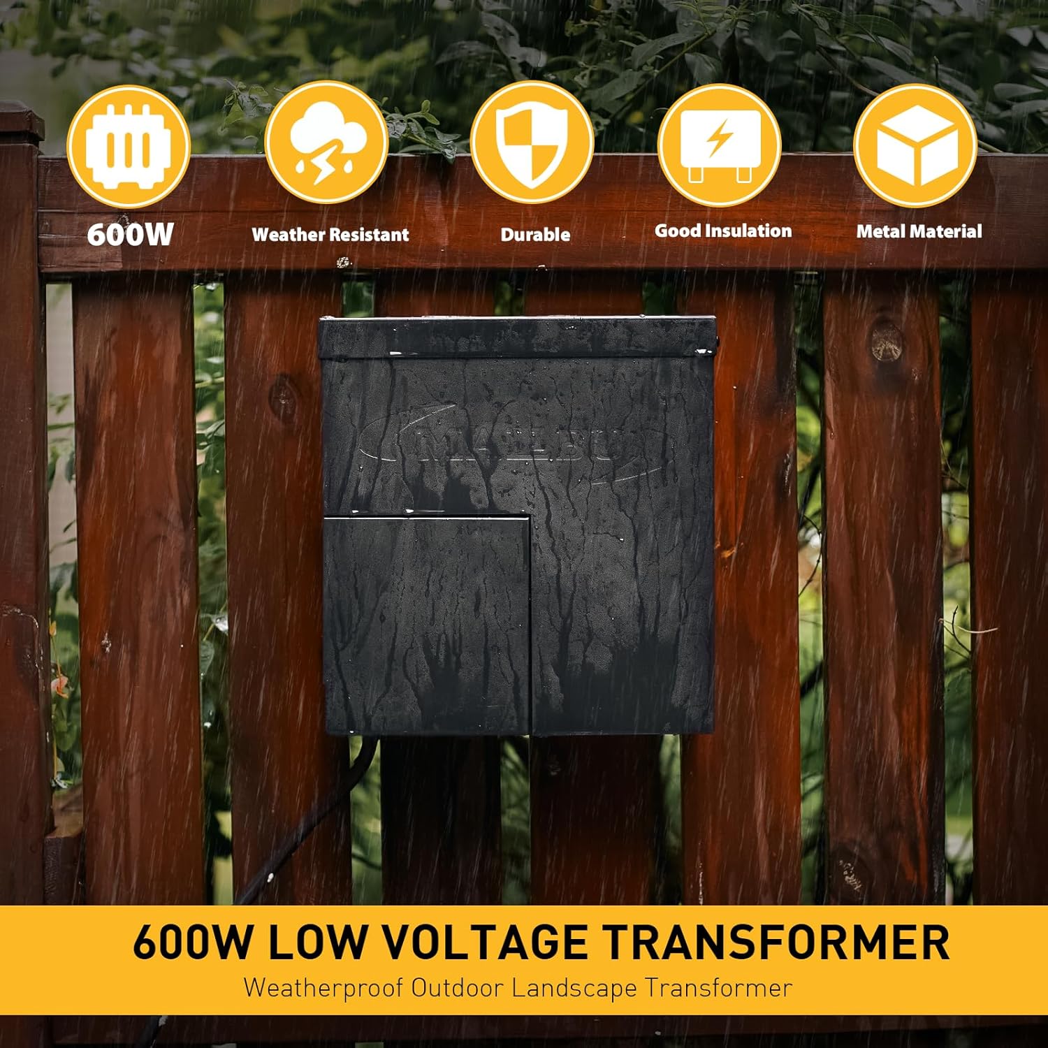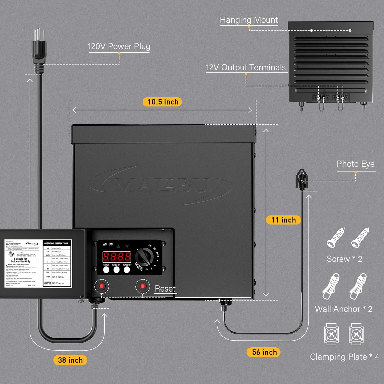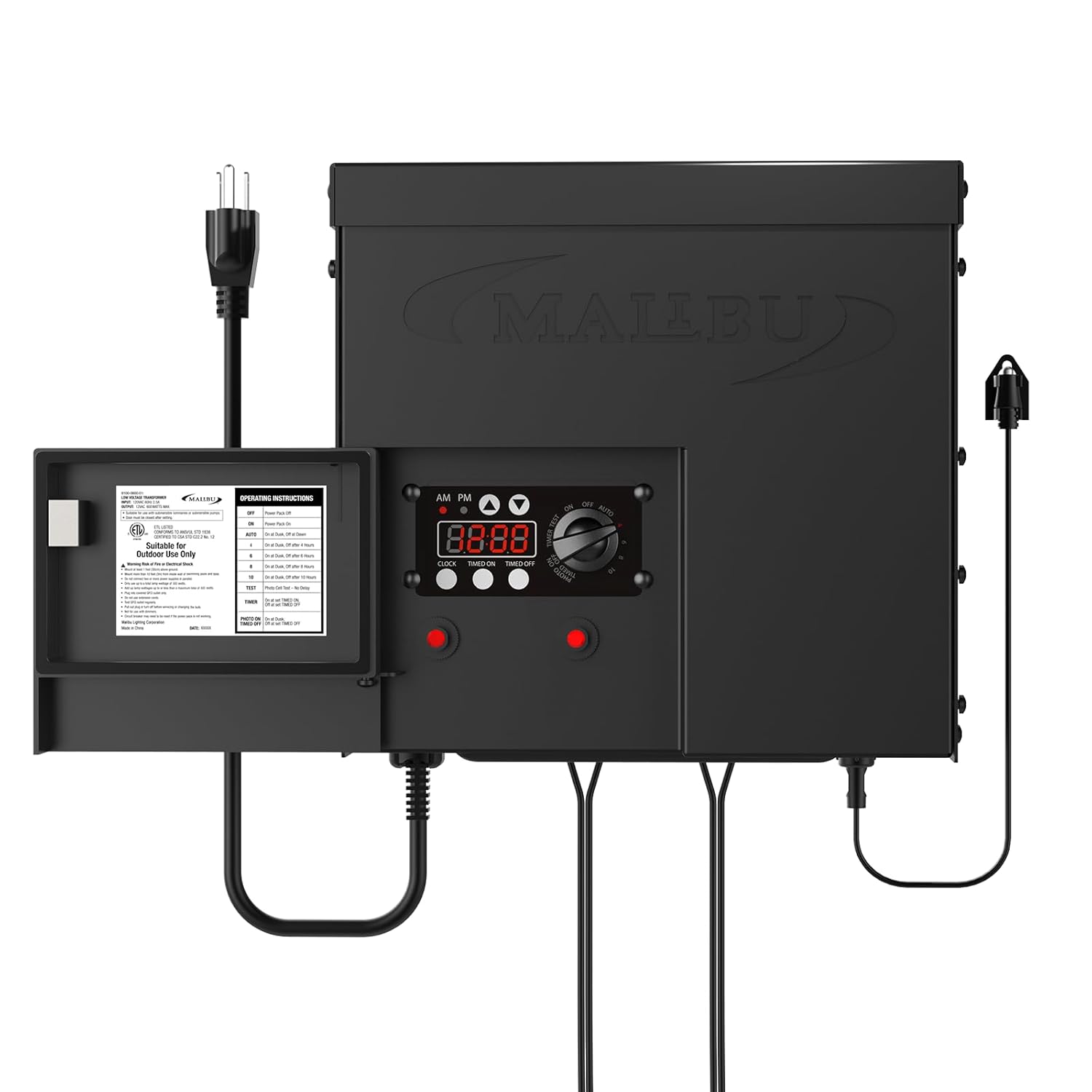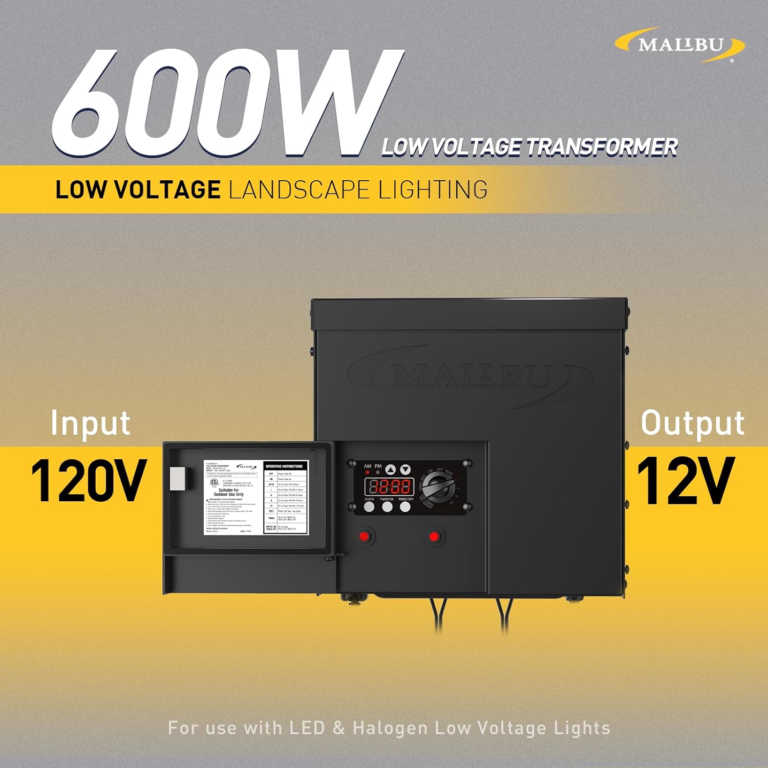 - Wide Application: The MALIBU low voltage transformer is available in 45/120/200/300/600/900W options, converting 120V AC household voltage to 12V AC safety voltage. This provides a safer and more practical electrical current level, making it compatible with most low-voltage LED and halogen landscape lighting, including spotlights, pathway lights, garden lights, and more