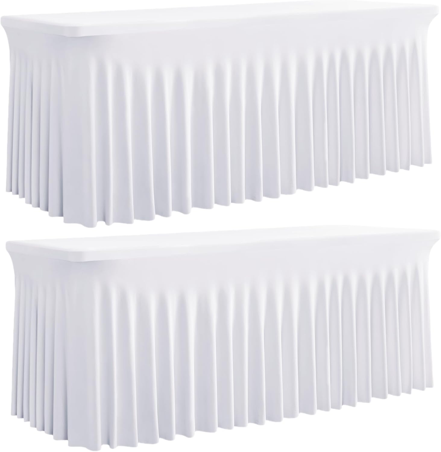 Outpain White Spandex Table Clothes for 5 Foot Rectangle Tables-2Pack 5FT Spandex Fitted Table Cover, Wrinkle Free Tablecloths with Skirt for Parties, Wedding, Birthday, Banquet, Festival