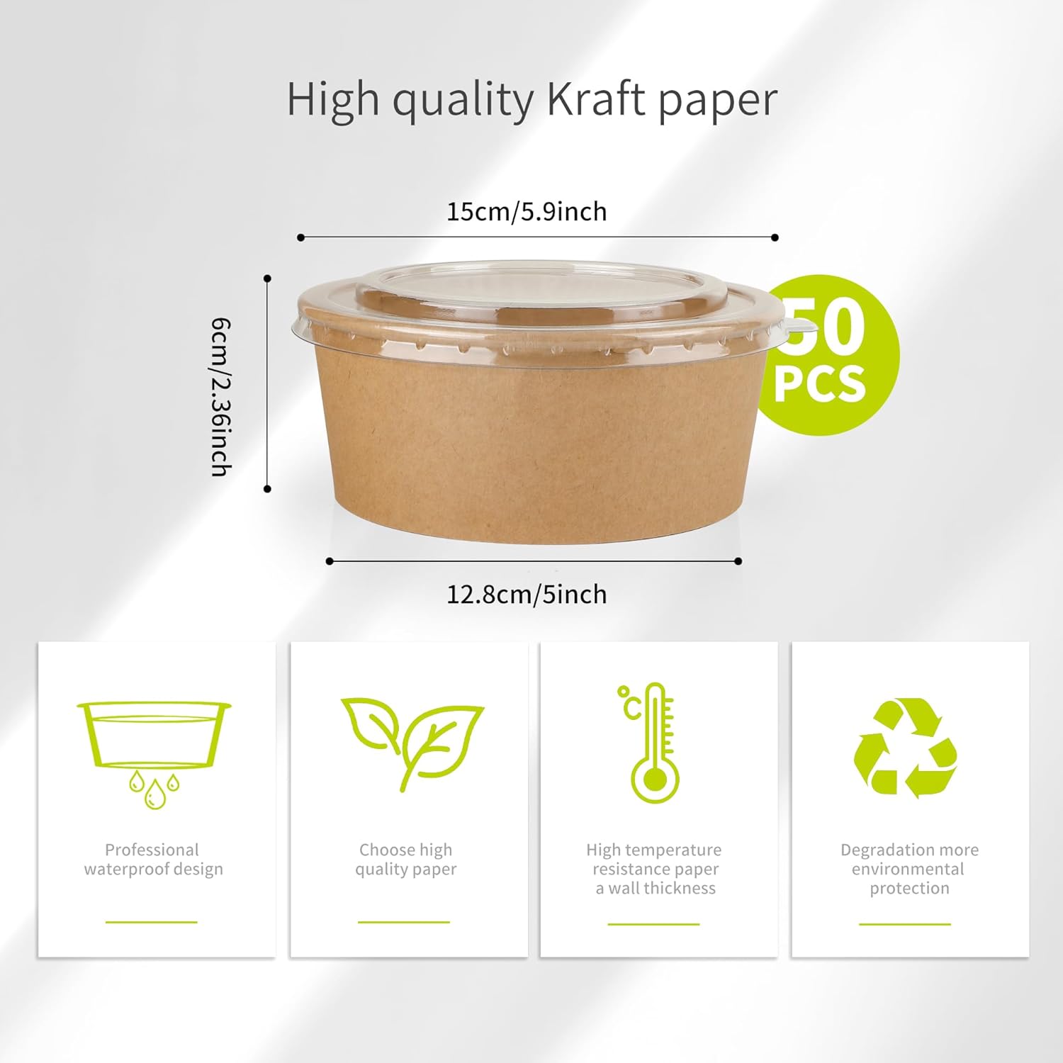 - Paper Bowls with Lids Value Pack : Set of 50 Pcs disposable paper bowl Includes 50 transparent Lids, Each 750ml can hold 25 ounces, container height : 2.36 in, cup bottom : 5 in, top edge diameter : 5.9 in, perfect size and easy to use.