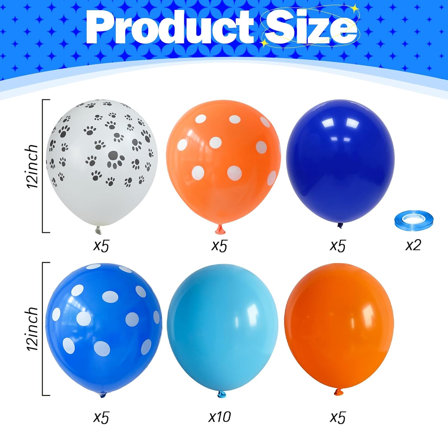 - ๐ฆด Blue and Orange Balloons Set: This is a beautiful bright balloon, which contains balloons of different colors. Include 12 inch dog paw print balloon(5pcs), light blue balloon(10pcs), royal blue balloon(5pcs), orange balloon(5pcs), orange white print balloon(5pcs), dark blue white print balloon(5pcs), 2 rolls of ribbons. You can use these different shades of blue and orange balloon kits, DIY balloon combinations to create your birthday party.