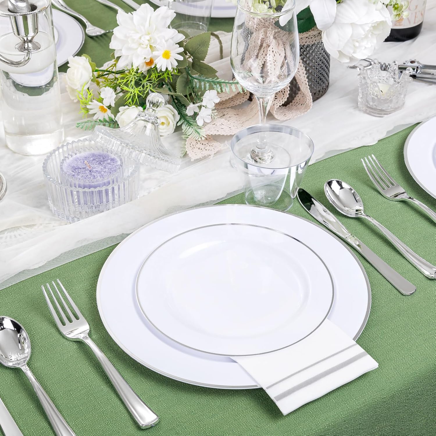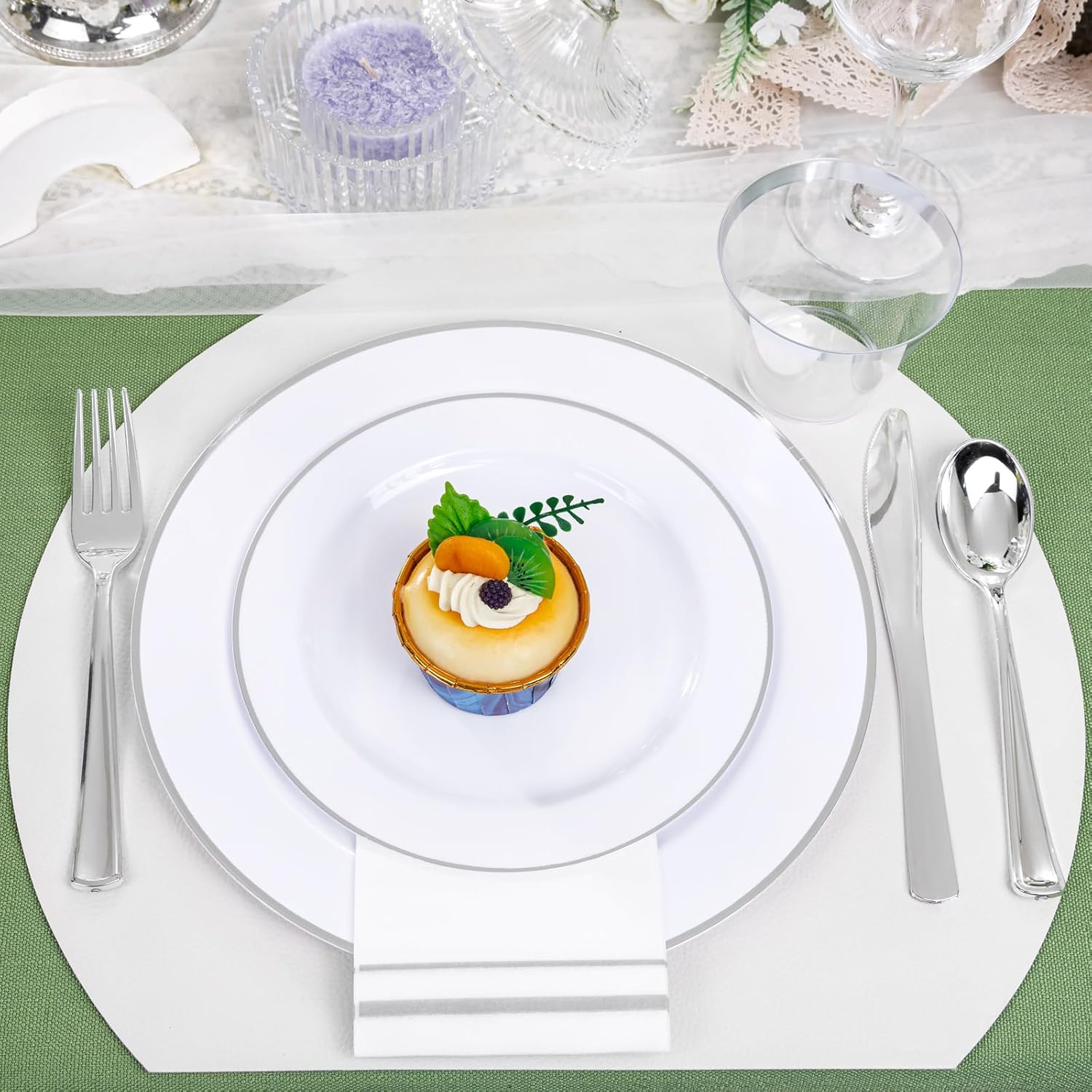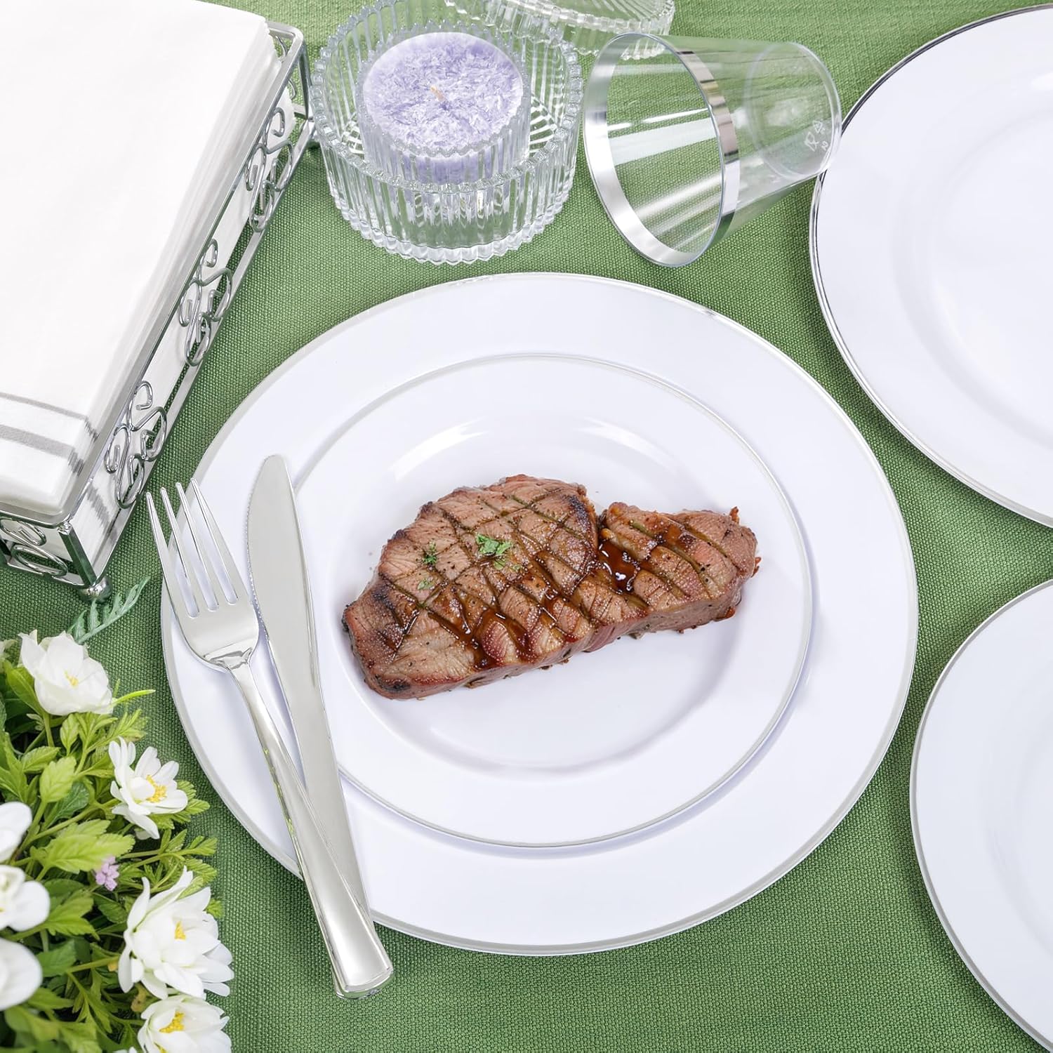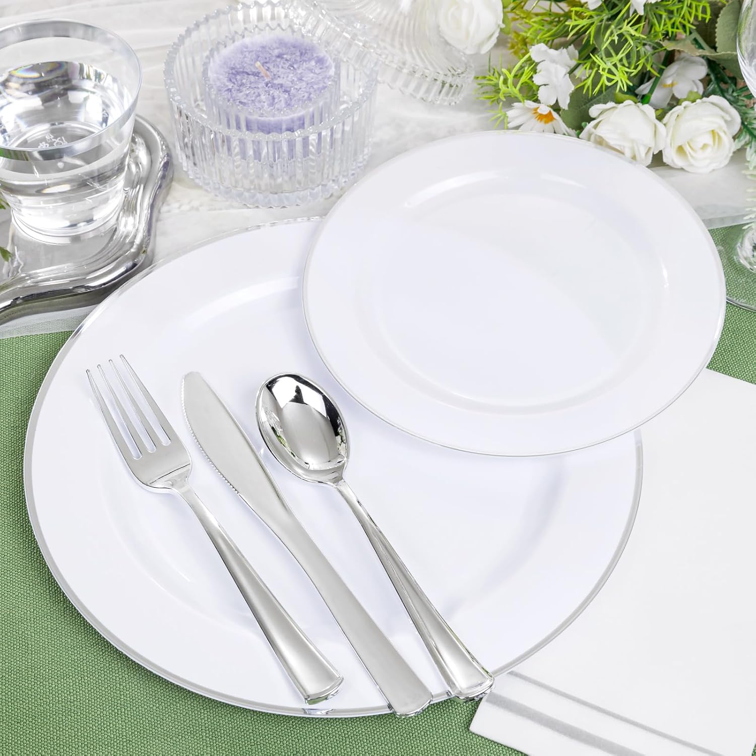 - WHAT YOU GET: 175pcs white plates disposable for 25 guests, Include: 25 dinner Plates, 25 dessert Plates, 25 napkins,25 silver silverware, 25 Cups. It is great party plates.