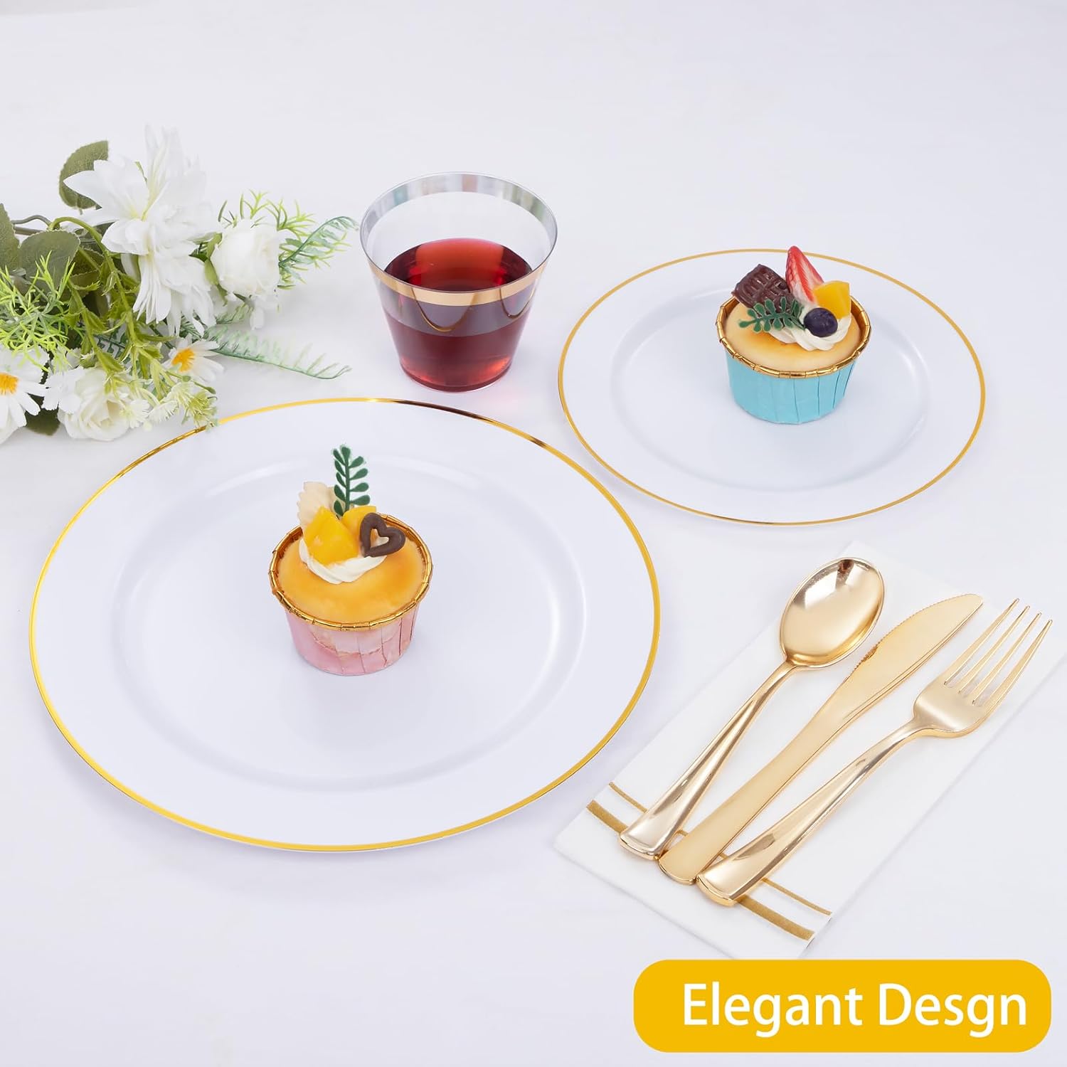 - VERSATILE FOR DIFFERENT OCCASIONS: Whether it's a family dinner, a holiday celebration like Christmas or Thanksgiving, or a dinner party, this gold plastic dinnerware set fits right in. The classic white and gold combination is timeless and can be easily paired with different tablecloths, napkins, and centerpieces to create a customized and elegant table decor.