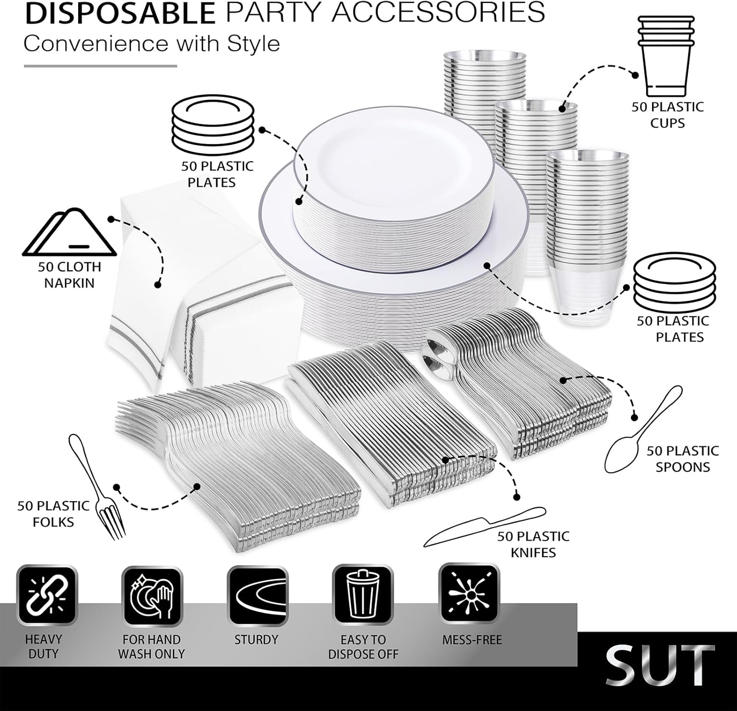 SUT 350 Piece Silver and White Plastic Dinnerware Set for 50 Guests, Disposable Plastic Plates, Include: 50 Dinner Plates, 50 Dessert Plates, 50 Pre Rolled Napkins with Silver Silverware, 50 Cups
