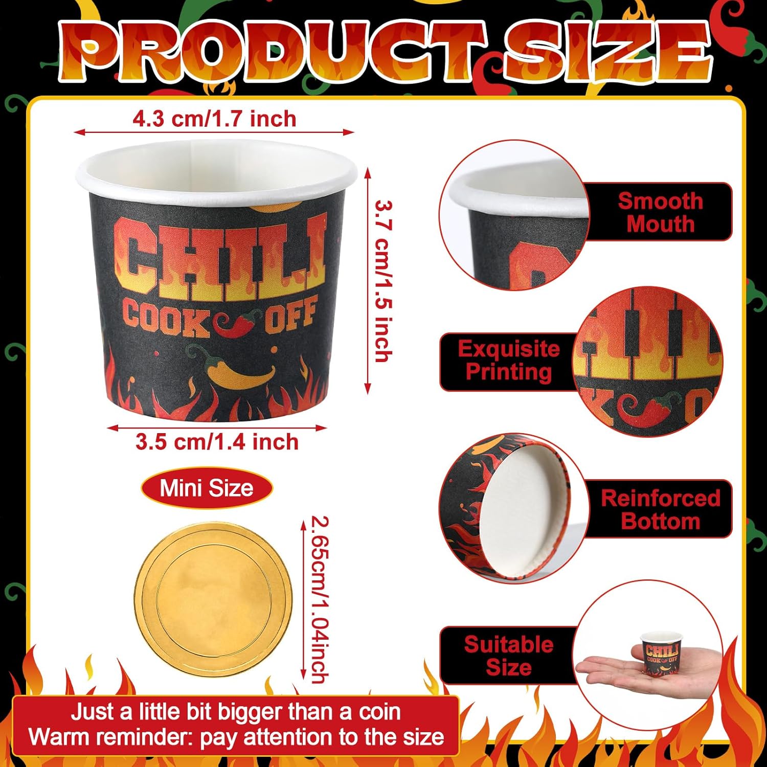 - Mini Chili Cook off Decorations: each package consists of 300 mini chili cook off food sample cups, ensuring that you have enough to cups to large gatherings; Each chili pattern and text printed on these cups make them more formal and attractive, making them ideal for festivals, parties, chili festivals, chef competitions; Note: the capacity of the sauce cup is very small and is not suitable for storing larger candies, potato chips, ham, and more