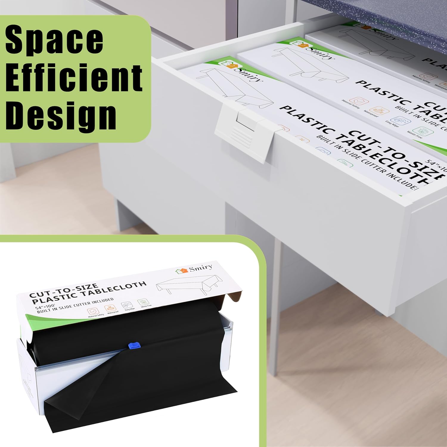 - [Easy Selection of Size with Sliding Cutter] This tablecloth roll comes in a handy box with cut-out tools that allow you to easily cut to the size you need. This plastic table cover roll is suitable match for rectangular, square, round or oval tables.