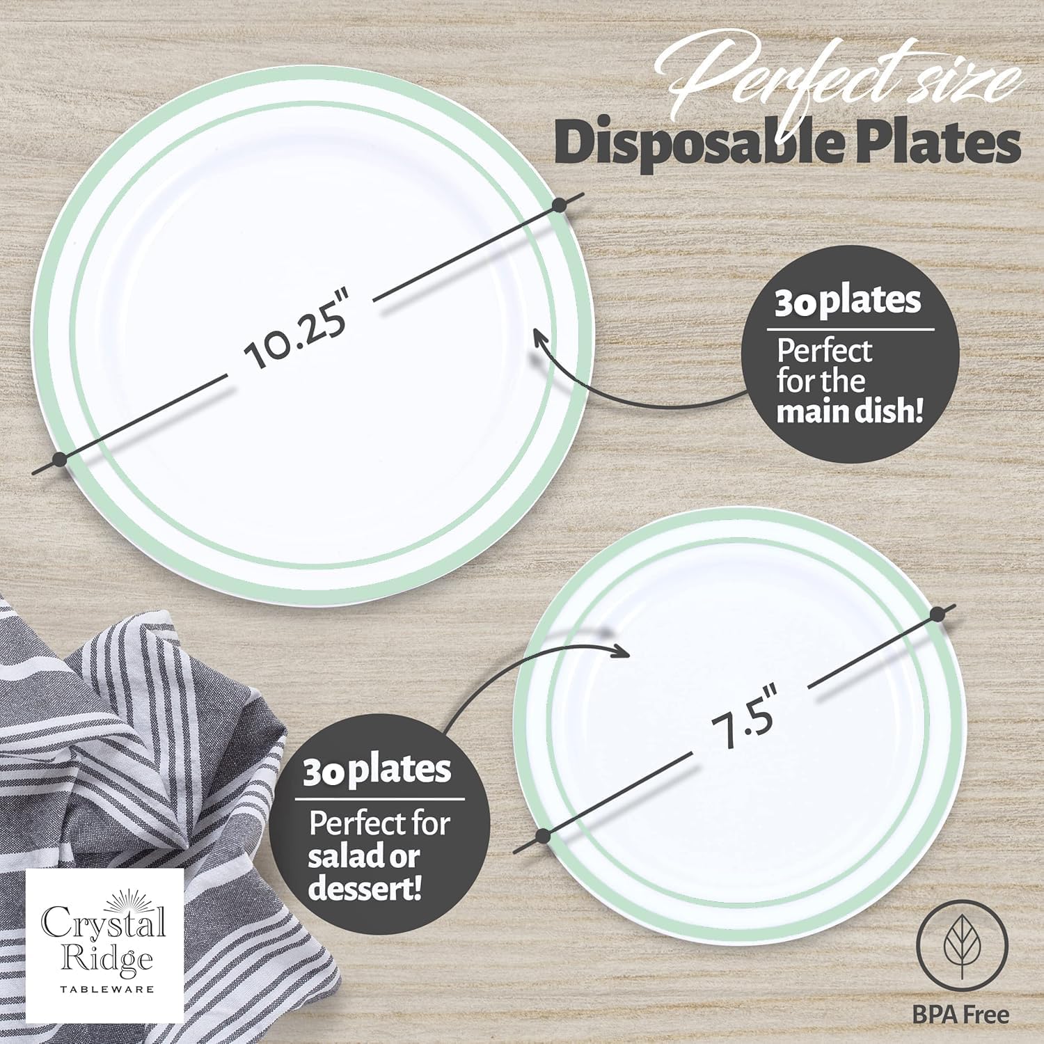 60 Pieces White Plastic Disposable Plates - Premium Heavy-Duty 30 Dinner Plates & 30 Salad Plates with Mint Green Rim Ideal for Party, Birthday and Special Events