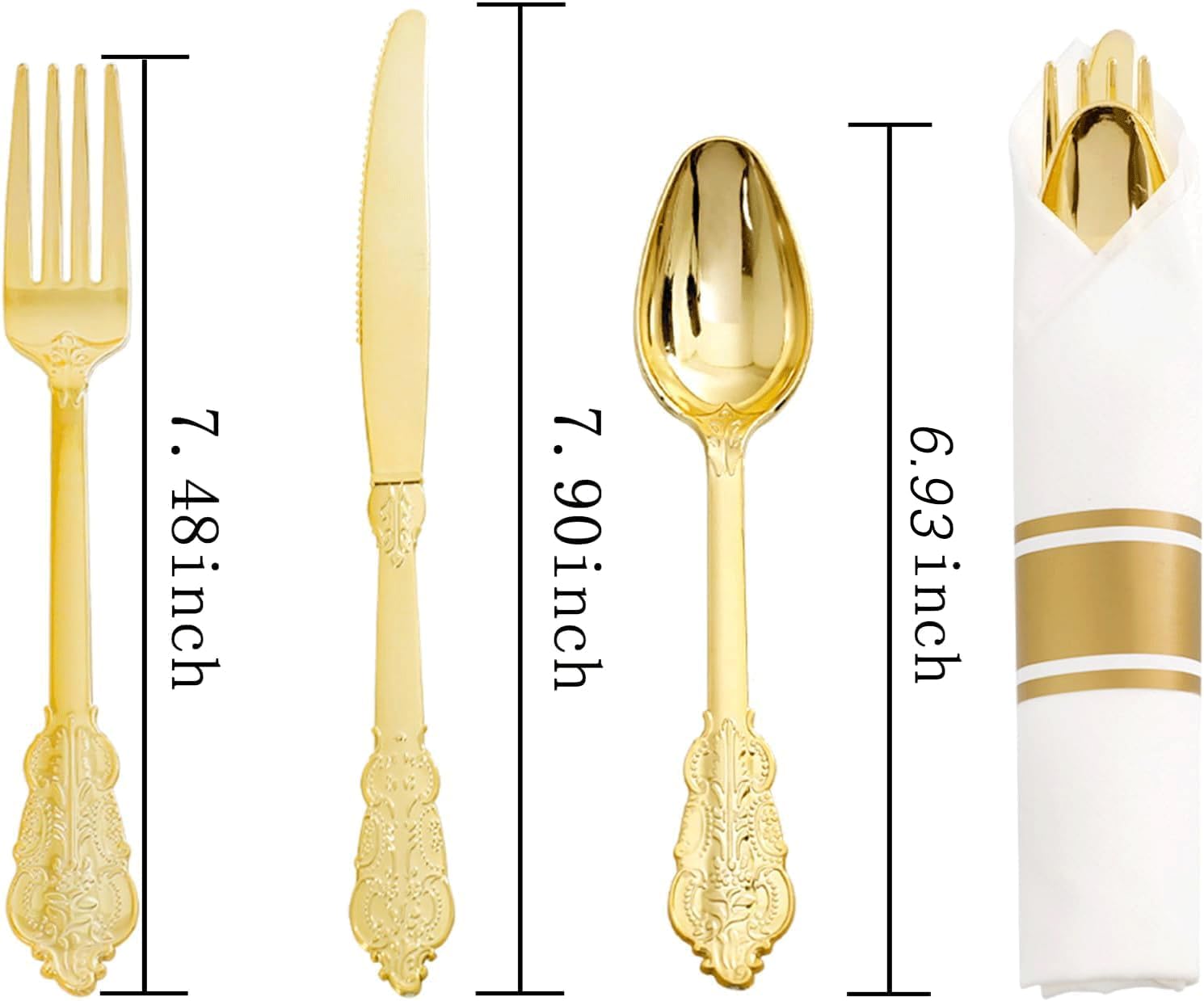 - Value Packaging:The gold plastic silverware include 100 plastic forks ,100 plastic knives ,100 plastic spoons,100 napkins to fully serve 100 guests.This gold wrapped plastic cutlery set with napkin is suit for large banquet