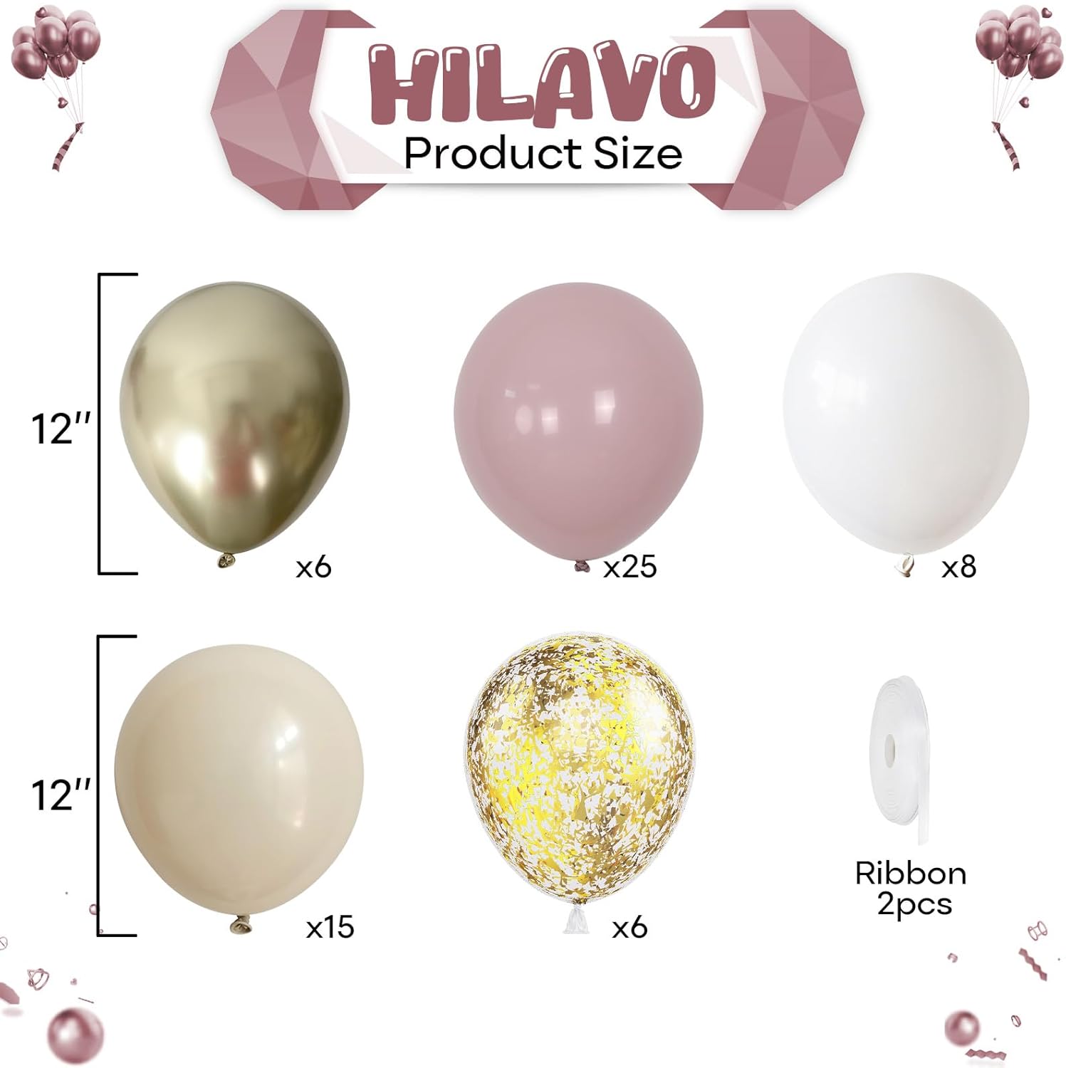 - 🌸 Dusty Pink and Gold Balloons Set: This is a beautiful bright balloon, which contains balloons of different colors. Include 12 inch dusty pink balloon(25pcs), retro white sand balloon(15pcs), white balloon(8pcs), metallic gold balloon(6pcs), gold confetti balloon(6pcs), 2 rolls of ribbons. You can use these different shades of fog pink and gold balloon kits, DIY balloon combinations to create your birthday party.