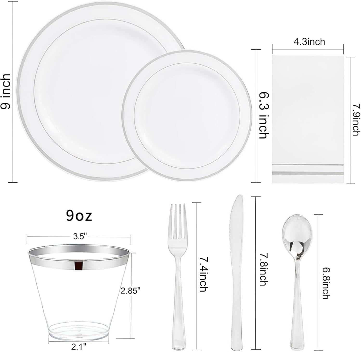 GATHER 700PCS Silver Plastic Plates - Silver Plate Set 100Guest - Disposable Dinnerware Sets 100Silver Rim Dinner Plates 100Silver Dessert Plate 100Paper Napkins&Cups&silver Plastic Silverware Set