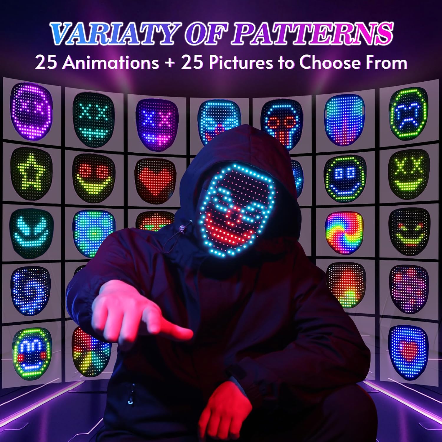 - 50 Cool Face Patterns: This led mask features 234 high-brightness LED beads, offering stunning clarity and brightness that looks amazing in the dark. With 25 dynamic and 25 static patterns to choose from, you'll be the star of any Halloween event