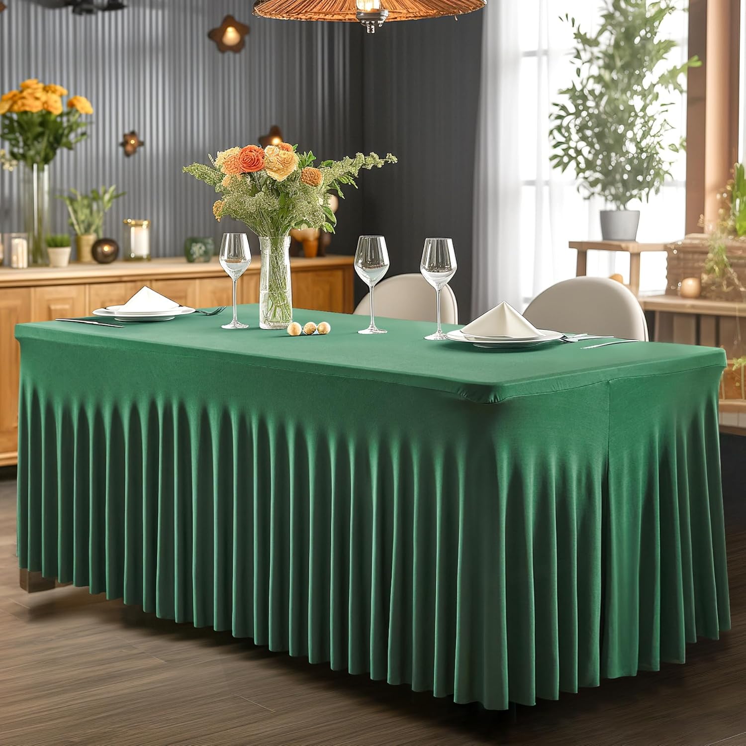 2 Packs Green Table Clothes for 8 Foot Rectangle Tables, One-Piece Wrinkle Resistant Stretch Spandex Table Covers Christmas Table Skirt for Event Banquet Wedding Birthday Party