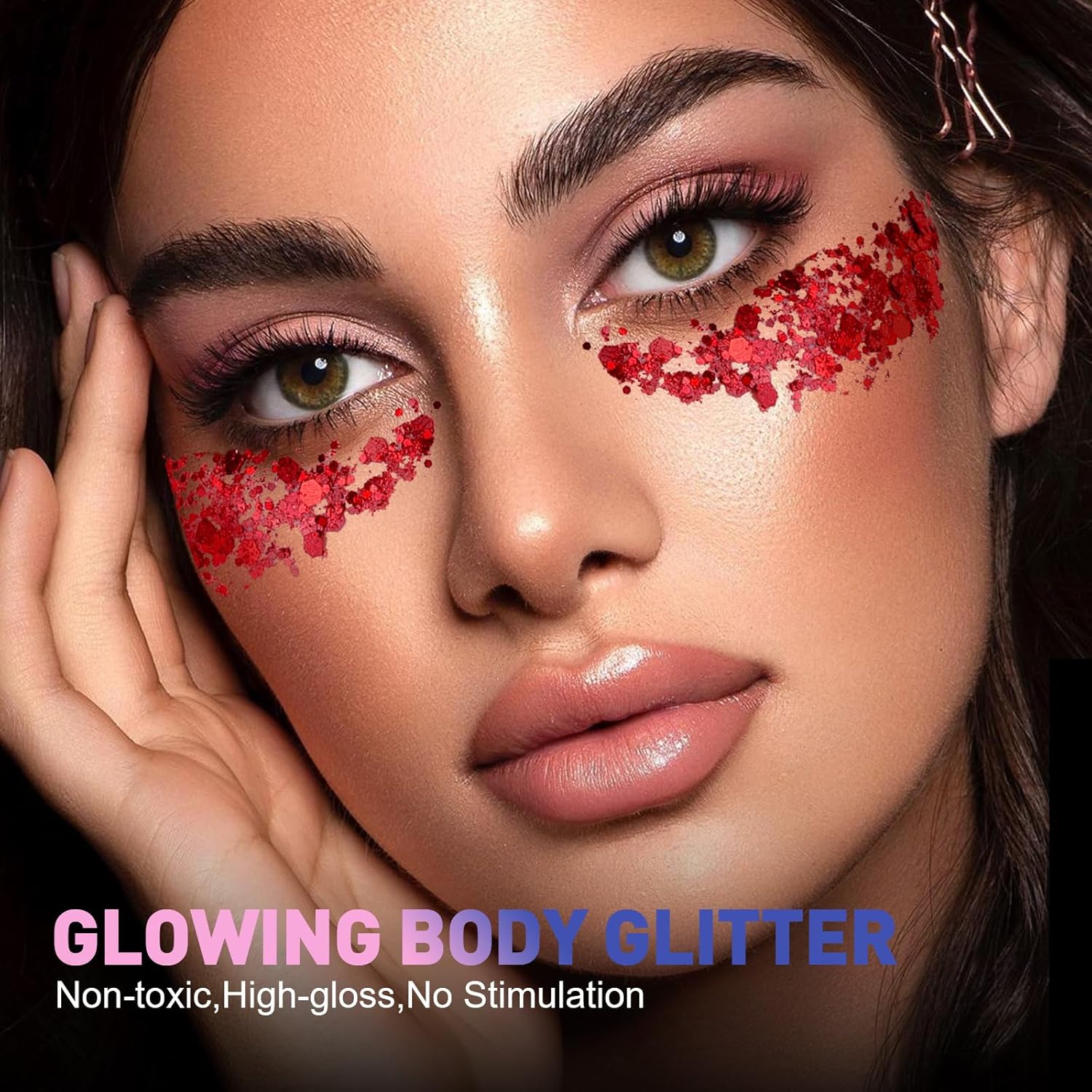 - 【40 COLORS BODY GLITTER】: Our valentine face glitter gel includes 24 colors glitter gel, 6 colors laser glitter gel, 10 colors dark glow glitter gel.This glitter makeup has a good mix of larger chunks and very fine glitter that makes it look very shimmery