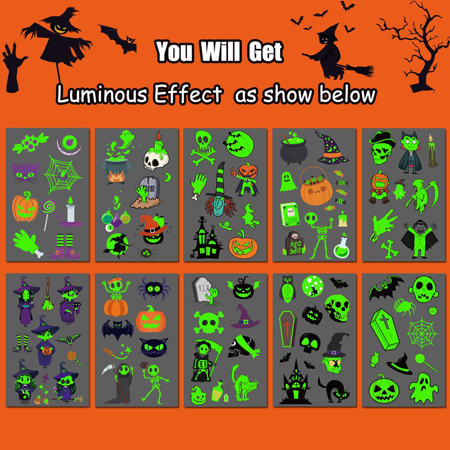 - Glow Halloween Tattoos for Kids Party Favors: These super cute elements in Halloween temporary tattoos include skeletons, vampire, pumpkins, witches and other Halloween-related patterns! Everyone from toddlers, kids, boys, girls will love these, much fun and cute