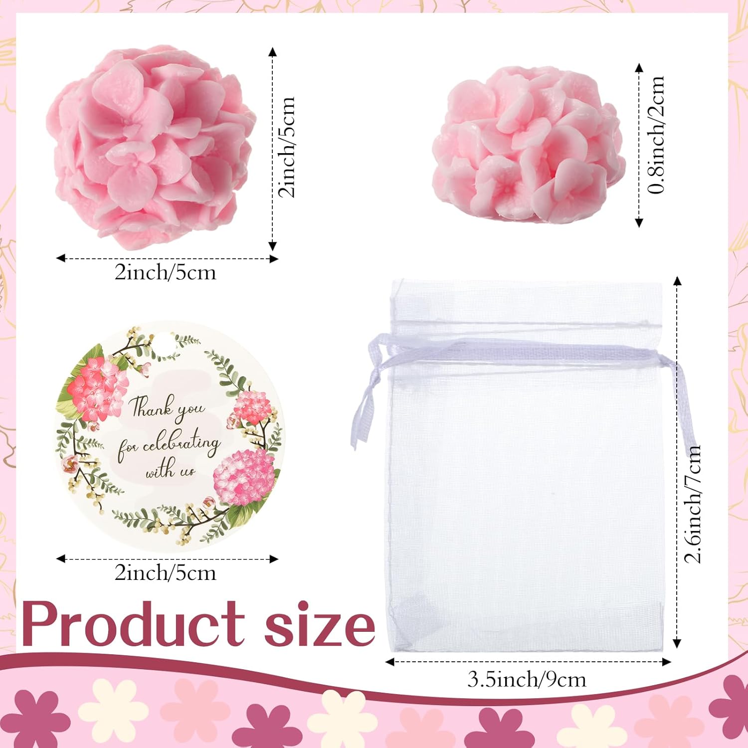 - Complete Package: our thoughtful package includes 24 x flower scented soap designed as the hydrangea flower style in cream white, light pink, dark pink colors, 24 x organza bag with white ribbon straps, and 24 x small thank you card; The card with the words 'Thank you for celebrating with us'; This package is all you need to commemorate a special occasion, celebrate a festivity or simply show your appreciation